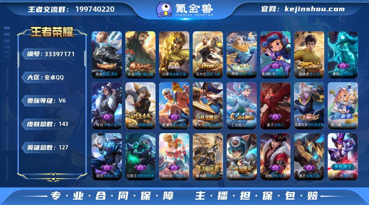 实名: 可修改 贵族等级: V6 英雄数: 127 皮肤数: 143 荣耀水晶: 鸣剑·曳影 传说皮: 黄金狮子座,冠军飞将,神骥·镇沧海 限定皮: 李小龙,梁祝