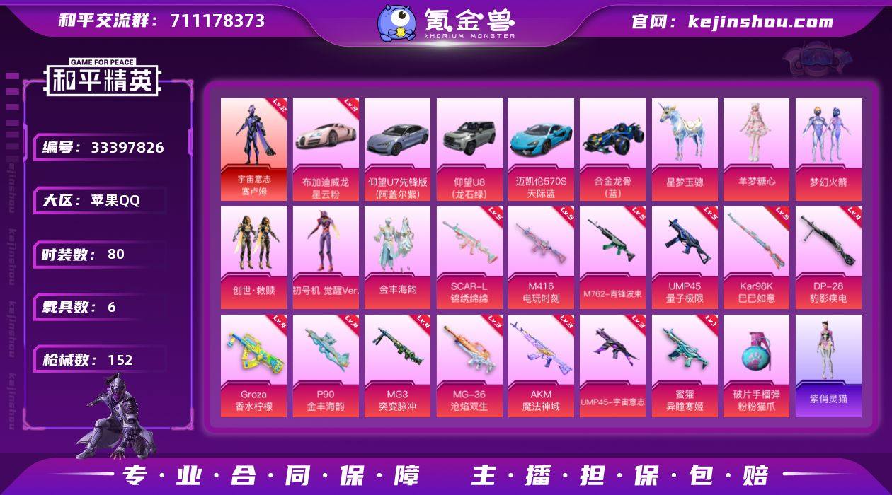 【LHPX454】80套装/枪械14/装备222/载具6/战备109/王牌印记5/热力值57629/三级AKM-魔法神域/五级SCAR-L-锦绣绵绵/五级M416-电玩时刻/四级GROZA-香水柠檬/五级M762-青锋波束/一级蜜獾-异瞳寒姬/五级UMP45-量子极限/三级UMP45-宇宙意志/四级P90-金丰海韵/五级Kar98K-巳巳如意/四级DP-28-豹影疾电/四级MG3-突变脉冲/三级MG-36-沧焰双生/二级宇宙意志-塞卢姆/三级布加迪威龙(星云粉)/宇宙意志-塞卢姆/梦幻火箭(新101)/忍者信条/龟仙人/8号机/Mark.06/创世·救赎/初号机 觉醒Ver./金丰海韵/羊梦糖心/仰望U7先锋版(阿盖尔紫)/仰望U8(龙石绿)/迈凯伦570S(天际蓝)/布加迪威龙(星云粉)/合金龙骨(蓝)/星梦玉骢/AKM魔法神域/SCAR-L-锦绣绵绵/M416电玩时刻/Groza香水柠檬/M762-青锋波束/蜜獾-异瞳寒姬/UMP45量子极限/UMP45-宇宙意志/P90-金丰海韵/Kar98K-巳巳如意/DP-28-豹影疾电/MG3-突变脉冲/MG-36-沧焰双生/破片手榴弹粉粉猫爪/深渊漩涡飞行器/梦幻火箭降落伞/香水柠檬降落伞/星之彼岸降落伞/环太平洋降落伞/炫光之旅降落伞/夜幕颂歌降落伞/猪猪侠降落伞/繁龙极客降落伞/星梦奇缘降落伞/初号机 觉醒Ver.降落伞/金丰海韵降落伞/忍者神龟降落伞/宇宙意志降落伞/时空协奏降落伞/喜羊羊与...