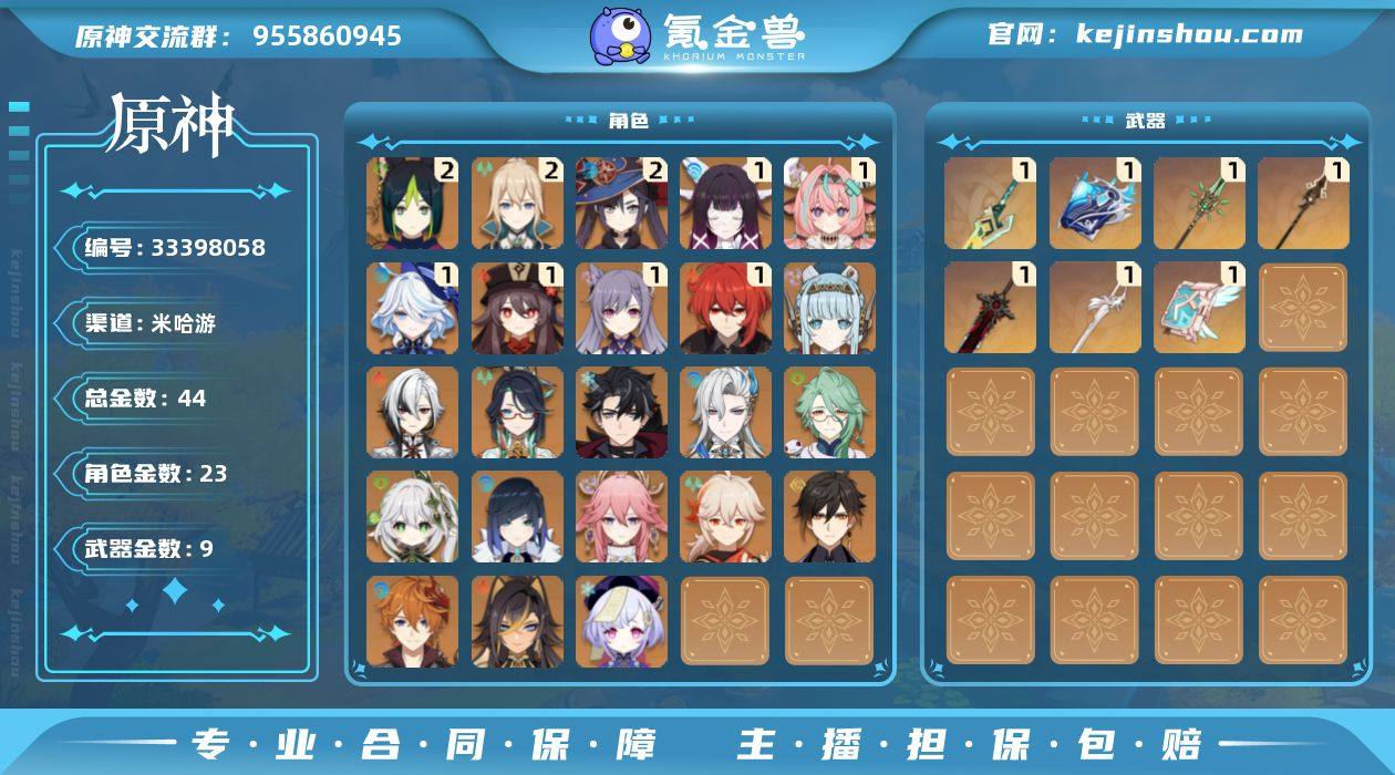 邮箱: 未绑定 总黄数: 44 冒险等级: 59 2命金色角色: 二命莫娜,二命琴,二命提纳里 1命金色角色: 一命迪卢克,一命刻晴,一命胡桃,一命芙宁娜,一命瓦雷莎,一命哥伦比娅 0命金色角色: 枫原万叶,七七,达达利亚,钟离,八重神子,夜兰,纳西妲,迪希雅,白术,那维莱特,莱欧斯利,闲云,阿蕾奇诺,伊涅芙 拥有武器: 狼的末路,天空之卷,和璞鸢,风鹰剑,贯虹之槊,万世流涌大典,山王长牙 1精武器: 狼的末路,天空之卷,和璞鸢,风鹰剑,贯虹之槊,万世流涌大典,山王长牙 亮点: 【sy143】59级/44黄/男主/23个五星角色/9个五星武器0命阿蕾奇诺,0命闲云,1命芙宁娜,0命莱欧斯利,0命那维莱特,0命白术,0命迪希雅,0命纳西妲,2命提纳里,0命夜兰,0命八重神子,0命枫原万叶,0命钟离,1命胡桃,0命达达利亚,1命刻晴,0命七七,2命琴,2命莫娜,1命迪卢克,1命瓦雷莎,0命伊涅芙,1命哥伦比娅,精1万世流涌大典,精1和璞鸢,精1贯虹之槊,精1天空之卷,精1风鹰剑,精1狼的末路,精1山王长牙