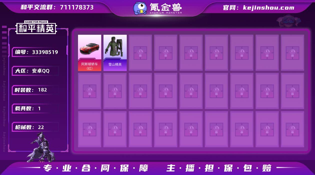 59102|【可实名】精品脱坑号 可二次 安卓QQ 1载具(阿斯顿·马丁DBS 红) 低价出安卓QQ 历史总热力值:7748 载具数量:1 历史最高段位:不朽星钻Ⅴ 套装数量:31 时装数量:182 枪械数量:22 战备数量:32 装备数量:22 载具:阿斯顿·马丁DBS(红) 时装:套装-SS13特训,套装-SS14特训,套装-SS17特训,套装-SS4特训,套装-SS5特训,套装-SS6特训,套装-SS7特训,套装-传奇侦探,套装-军械专家,套装-北国孤狼,套装-圣诞大吉,套装-坚韧舞者,套装-完美偶像,套装-极速红龙,套装-海滨突袭者,套装-滨海假日,套装-火舞潮人,套装-燃烧卡路里,套装-疯狂小兔子,套装-竞技勇士朋克,套装-竞技达人朋克,套装-绮丽涂鸦,套装-耀粉歌者,套装-萌黄之夏,套装-蓝色守护者,套装-跃动心情,套装-雪山精英,套装-青春校园,套装-飞行日记,套装-魅力单车,套装-黑色伏地魔 枪械:AKM-夜灯,AKM-破晓战魂,AKM-霓虹街区,AUG-炫光贝贝,M16A4-夜灯,M416-蓝色火焰,SCAR-L-生命誓言,Kar98K-彩虹符号,Kar98K-红色方程式,UMP45-春暖花开,UZI-生命誓言,Vector-彩虹符号,S1897-潮汐统领,S686-生命誓言,M249-破晓战魂,平底锅-飞行日记,撬棍-传奇侦探 战备:粉色滑翔尾迹,阿狸红降落伞,光子定制降落伞,勇者同行降落伞,奇异狩猎者降落伞,放飞梦...