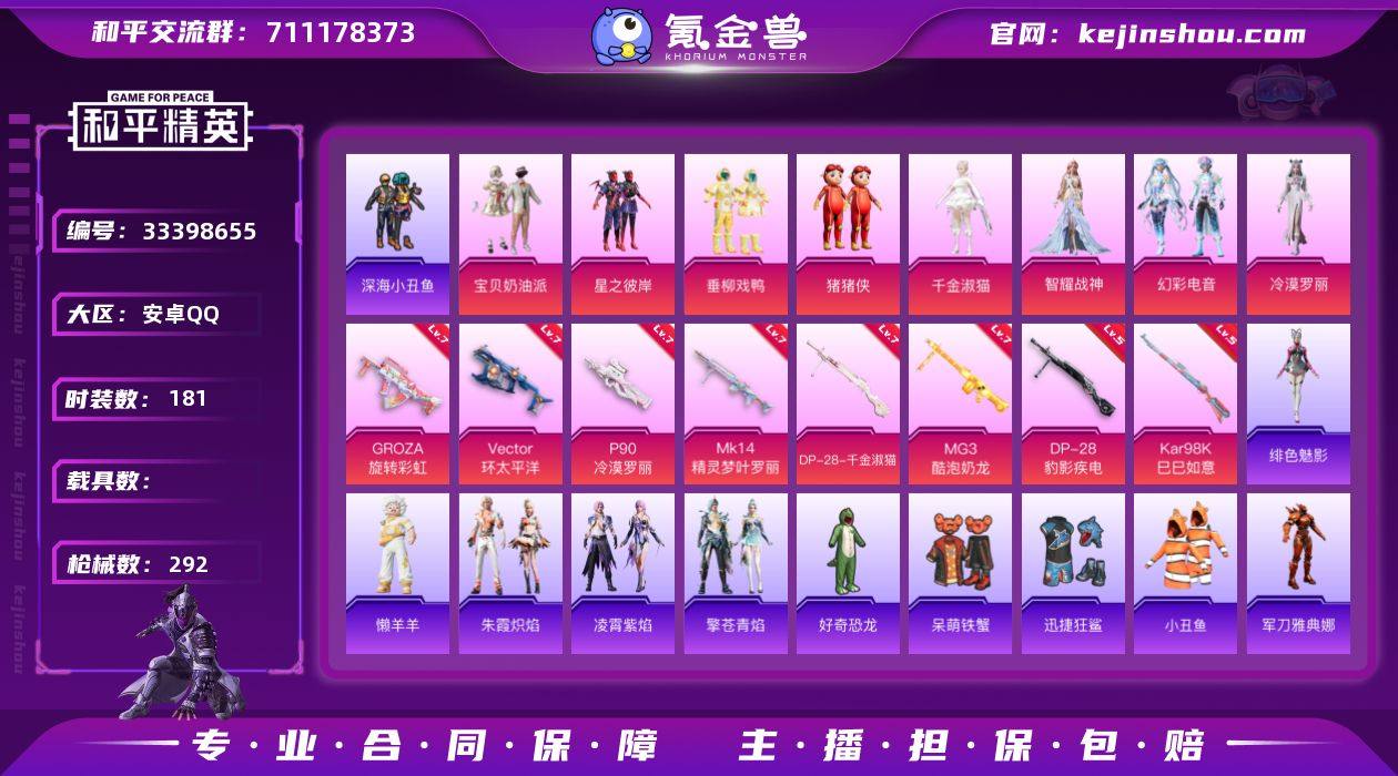 安卓 手Q-8粉装-9特效枪-0载具-5粉色飞行器-84087热力值-9王牌印记-181套装-292枪皮 【热门品类】:套装-深海小丑鱼,套装-小丑鱼,角色-军刀雅典娜,套装-星河浪客,套装-龟仙人 【粉色套装】:粉装-宝贝奶油派,粉装-星之彼岸,粉装-垂柳戏鸭,玩偶服-猪猪侠,角色-千金淑猫,角色-智耀战神,粉装-幻彩电音,角色-冷漠罗丽 【粉色枪皮等级】:GROZA-旋转彩虹(七级),Vector-环太平洋(七级),P90-冷漠罗丽(七级),Kar98K-巳巳如意(五级),Mk14-精灵梦叶罗丽(七级),Mk14-福马献瑞(五级),DP-28-千金淑猫(七级),DP-28-豹影疾电(五级),MG3-酷泡奶龙(七级) 【粉色枪皮】:GROZA-旋转彩虹,Vector-环太平洋,P90-冷漠罗丽,Kar98K-巳巳如意,Mk14-精灵梦叶罗丽,Mk14-福马献瑞,DP-28-千金淑猫,DP-28-豹影疾电,MG3-酷泡奶龙 【粉色飞行器】:炫彩糖果飞行器,星之彼岸飞行器,太空嘟嘟飞行器,镜光幻境飞行翼,脆鲨七海飞行器 【粉色降落伞】:甜心宝贝降落伞,至尊龙雀降落伞,星之彼岸降落伞,垂柳戏鸭降落伞,萌酷奶龙降落伞,猪猪侠降落伞,精灵梦叶罗丽降落伞,金丰海韵降落伞,忍者神龟降落伞,千金淑猫降落伞,樱桃泡泡降落伞,冷漠罗丽降落伞,荧海星豚降落伞,喜羊...