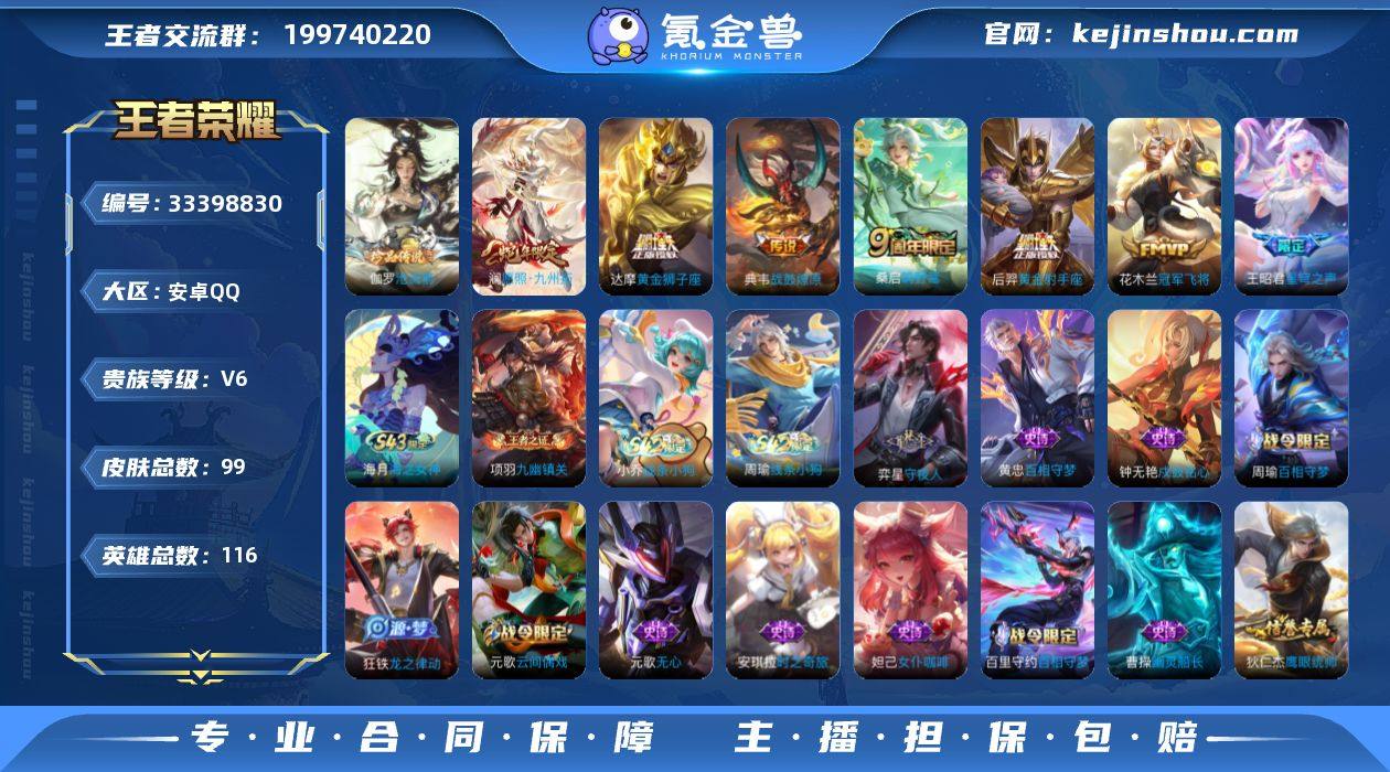 LK2641212有二次安卓Q-V6-最强王者段位-116英雄-99皮肤-1珍品传说-7传说-26史诗 【英雄全皮】:孙权全皮 【珍品传说】:伽罗沧流箭 【传说皮肤】:澜愿照九州拓,桑启鸣野蒿,典韦战鼓燎原,王昭君星穹之声,达摩黄金狮子座,花木兰冠军飞将,后羿黄金射手座 【限定皮肤】:狄仁杰阴阳师,赵云皇家上将,元歌云间偶戏,元歌无心,狄仁杰魔术师,项羽海滩派对,王昭君星穹之声,鲁班大师探海日志,桑启海盐诗旅,张良古海寻踪,鬼谷子天穹祈灯 【年限皮肤】:澜愿照九州拓 【赛季限定】:桑启海盐诗旅,鲁班大师探海日志,张良古海寻踪,鬼谷子天穹祈灯,东皇太一噬灭天穹,太乙真人谧流熔炉,钟馗虚灵犬护,甄姬逆浪荇歌,项羽九幽镇关 【战令限定】:元歌云间偶戏,百里守约百相守梦,老夫子百相守梦,孙膑茶境仙,马超访茗客,周瑜百相守梦,孙策百相守梦,周瑜线条小狗,小乔线条小狗 【史诗皮肤】:海月海之女神,周瑜线条小狗,小乔线条小狗,项羽九幽镇关,弈星守夜人,黄忠百相守梦,钟无艳戍鼓铭心,周瑜百相守梦,狂铁龙之律动,孙膑茶境仙,百里守约百相守梦,杨玉环银翎春语,元歌无心,安琪拉时之奇旅,元歌云间偶戏,狄仁杰鹰眼统帅,伽罗箭羽风息,白起星夜王子...