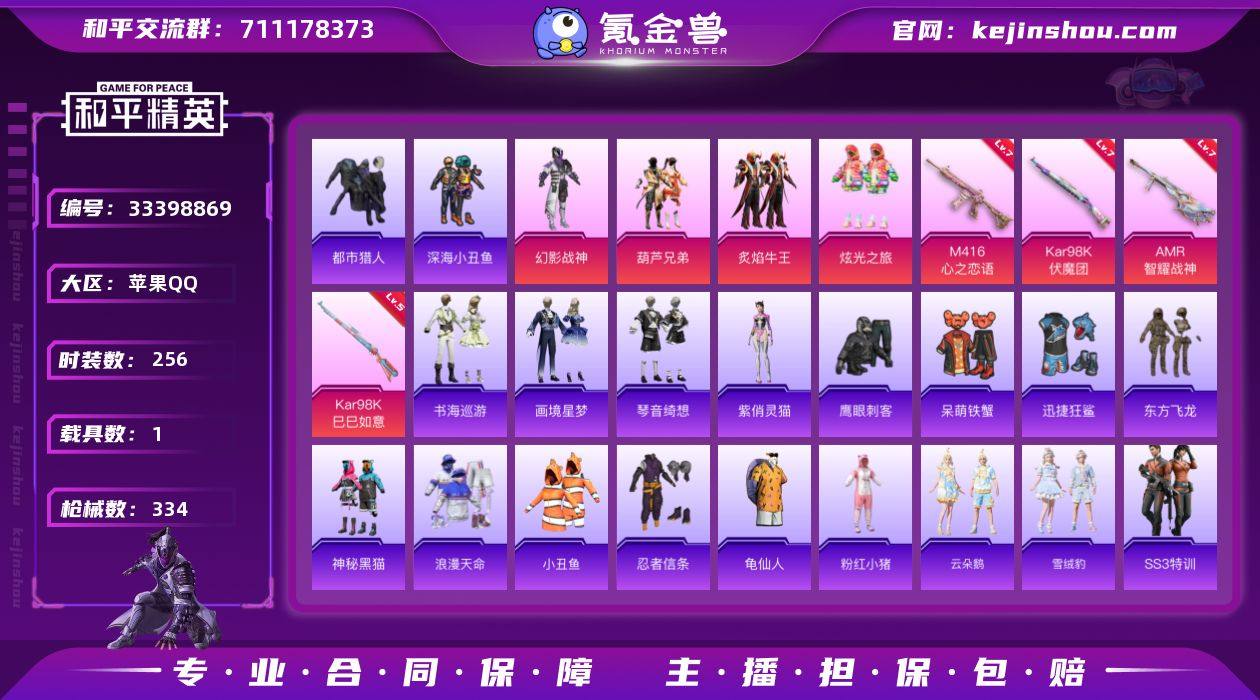 苹果 手Q-无敌战神框-4粉装-6特效枪-1载具-4粉色飞行器-106704热力值-23王牌印记-256套装-334枪皮 【热门品类】:套装-浪漫天命,套装-都市猎人,套装-深海小丑鱼,套装-小丑鱼,套装-忍者信条,旭日初心兜帽大衣,套装-龟仙人,套装-粉红小猪 【粉色套装】:粉装-幻影战神,粉装-葫芦兄弟,粉装-炙焰牛王,粉装-炫光之旅 【粉色枪皮等级】:M416-心之恋语(七级),UMP45-萌骑冒险(五级),Kar98K-伏魔团(七级),Kar98K-巳巳如意(五级),Mk14-福马献瑞(五级),AMR-智耀战神(七级) 【粉色载具】:霜月冰狼 【粉色枪皮】:M416-心之恋语,UMP45-萌骑冒险,Kar98K-伏魔团,Kar98K-巳巳如意,Mk14-福马献瑞,AMR-智耀战神 【粉色飞行器】:炫彩糖果飞行器,沙丘之主天马,曦光华影飞行器,冰狼掠影飞行器 【粉色降落伞】:绝对恒星降落伞,极限特训降落伞,幻影战神降落伞,神秘黑猫降落伞,四圣焕新降落伞,筑梦精灵降落伞,太空嘟嘟降落伞,彩虹甜喵降落伞,精灵之光降落伞,灵猫魔法师降落伞,极意拳锋降落伞,炫彩糖果降落伞,霜月狼主降落伞 【稀有套装】:套装-龟仙人,套装-雪国风尚,套装-炫彩糖果,套装-马上有钱,套装-迅捷龙虾,套装-遗迹猎人,套装-云朵鹅,套装-雪绒豹...