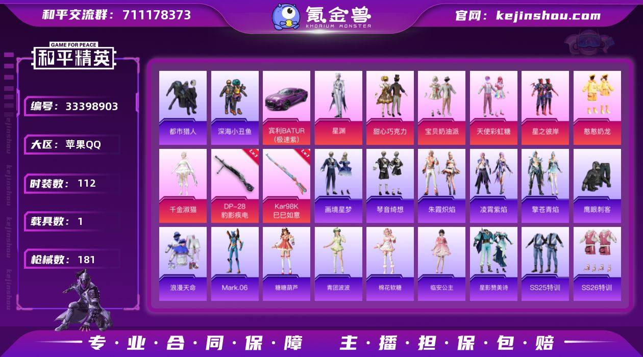 苹果 手Q-7粉装-3特效枪-1载具-3粉色飞行器-47488热力值-7王牌印记-112套装-181枪皮 【热门品类】:套装-浪漫天命,套装-都市猎人,套装-深海小丑鱼,角色-Mark.06 【粉色套装】:粉装-甜心巧克力,粉装-宝贝奶油派,粉装-天使彩虹糖,粉装-星之彼岸,粉装-憨憨奶龙,角色-千金淑猫,角色-星渊 【粉色枪皮等级】:Kar98K-巳巳如意(一级),Mk14-福马献瑞(五级),DP-28-豹影疾电(一级) 【粉色载具】:宾利BATUR(极速紫) 【粉色枪皮】:Kar98K-巳巳如意,Mk14-福马献瑞,DP-28-豹影疾电 【粉色飞行器】:炫彩糖果飞行器,星之彼岸飞行器,夜幕颂歌飞行器 【粉色降落伞】:甜心宝贝降落伞,春暖花开降落伞,星之彼岸降落伞,祥瑞锦鲤降落伞,金丰海韵降落伞,鬼刀降落伞,炫彩糖果降落伞 【稀有套装】:套装-雪国风尚,套装-炫彩糖果,套装-马上有钱,套装-糖糖葫芦,套装-青团波波,套装-棉花软糖,角色-临安公主,套装-星影赞美诗,套装-朱霞炽焰,套装-凌霄紫焰,套装-擎苍青焰,套装-画境星梦,套装-琴音绮想,套装-雨过天青,套装-红釉青花 【稀有枪皮】:AUG-冰晶雪宝,AKM-影袭,AKM-星之彼岸,AKM-缤纷海域,AKM-霓虹街区,AKM-龙的传人,M16A4-莲影清波,M16A4-蓝色火...