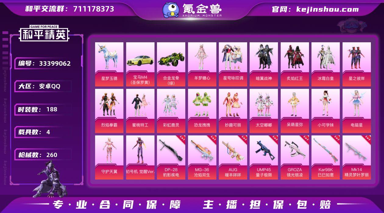 【觉醒螳螂17粉装15特效枪4载具 秒换绑不用等】 安卓Q区-94392热力值-188套装-260枪皮 【4载具】 合金龙骨(绿) 路特斯ELETRE(花绽灰) 星梦玉骢 宝马M4(圣保罗黄)【1稀有】 Mark.06蓝螳螂【17粉装】 角色-初号机 觉醒Ver. 蜜桃特工 冰霜白皇 星之彼岸 恐龙拽拽 太空嘟嘟 彩虹鹿灵 炙焰红王 暗翼战神 烈焰拳霸 呆萌星弥 小可学妹 妙趣可丽 角色-电磁星 星穹咏叹调 角色-羊梦糖心 角色-守护天翼【15特效枪】 M416-五爪金龙(1级) M416-心之恋语(7级) AKM-梦之光华(6级) SCAR-L-锦绣绵绵(5级) UZI-绮梦青鸾(5级) M762-冷魅冰骑(5级) Vector-灵感创作师(5级) SCAR-L-机甲封神(7级) Mk14-精灵梦叶罗丽(6级) Kar98K-巳巳如意(5级) AUG-暖羊咩咩(5级) GROZA-镜光银凌(5级) DP-28-豹影疾电(5级) MG-36-沧焰双生(5级) UMP45-量子极限(5级)【241热门】 暗夜契约(假黑丝) 浪漫天命 雪山精英(老6服) 激萌罗小黑 英勇保护者 团圆交子 瑞龙福将 狂沙舞者 M762-风花雪月 GROZA-林间仙鹿 SS27特训 SS22特训 Mk47-粉色回忆 SCAR-L-玉兔迎春 Mk47-乌木金纹 SKS-糯团青竹 UZI-娇憨猪猪 MG3-幻世战舞者 AKM-星之彼岸 万圣娃娃 M416-葫芦兄弟 青龙圣者 粉甜马卡龙 GROZA-彩虹符号 AUG-怪笑疯兔 M7...