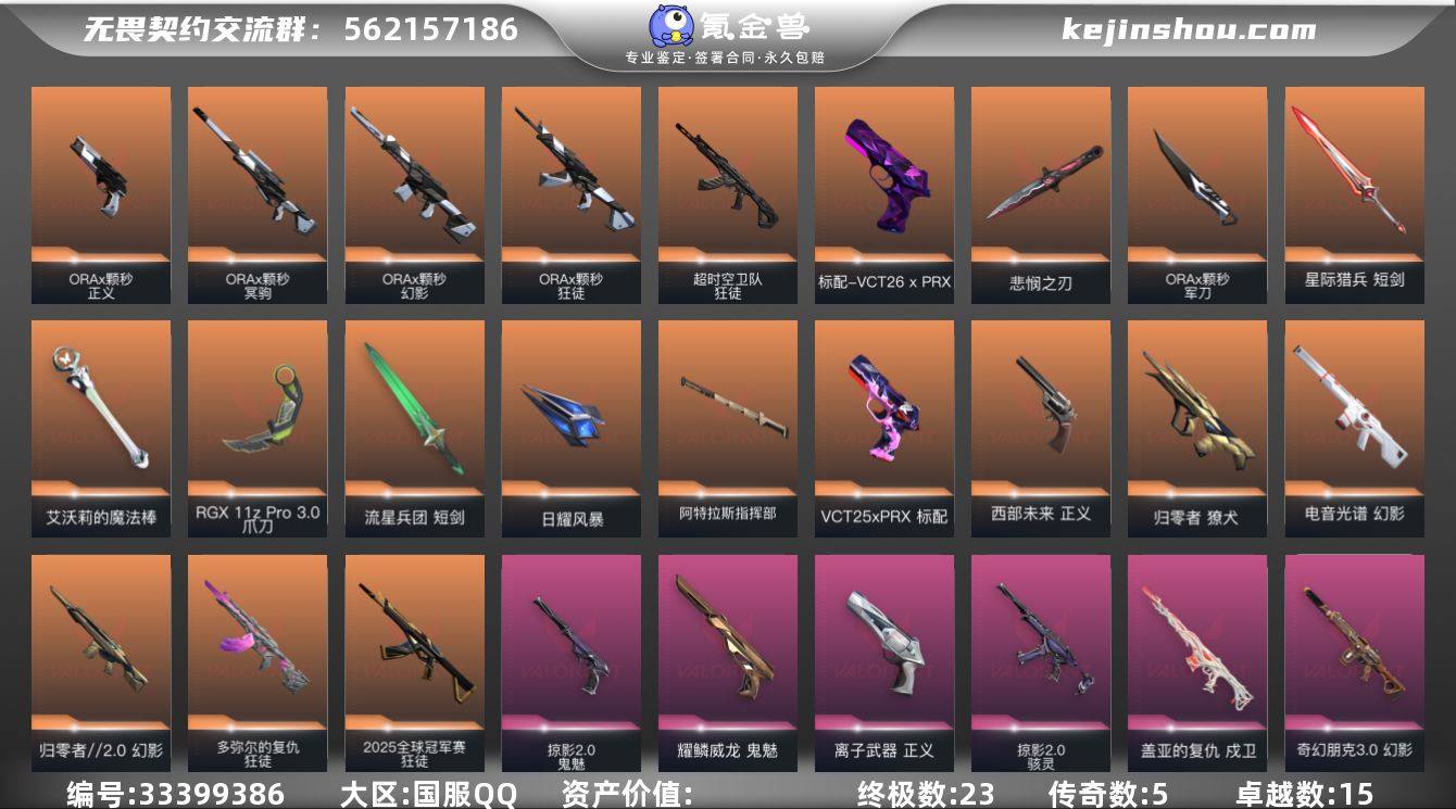 【957121】可二次 玩够可回血 精品账号 qyz9896 【近战武器】:近战武器-碎心裂刃,近战武器-无畏契约季前邀请赛 悲悯之刃,近战武器-ORA x 颗秒 军刀,近战武器-魔术火花,近战武器-影钩,近战武器-穿花蝴蝶,近战武器-紫金爪刀,近战武器-RGX 11z Pro//3.0 爪刀,近战武器-艾沃莉的魔法棒,近战武器-流星兵团 短剑,近战武器-生物分子解离器,近战武器-日耀风暴 遗器,近战武器-阿特拉斯指挥部 甩棍,近战武器-星际猎兵 短剑,近战武器-魔术火花 【狂徒】:狂徒-2025全球冠军赛,狂徒-多弥尔的复仇,狂徒-ORA x 颗秒,狂徒-超时空卫队,狂徒-堕天遗武,狂徒-掠影,狂徒-盖亚的复仇,狂徒-离子武器//2.0,狂徒-奇幻朋克//3.0,狂徒-流星兵团 【幻影】:幻影-归零者//2.0,幻影-电音光谱,幻影-ORA x 颗秒,幻影-异鳞魔蛇,幻影-掠影//2.0,幻影-奇幻朋克//3.0,幻影-电音光谱 【戍卫】:戍卫-盖亚的复仇,戍卫-战术熊与伙伴们 【獠犬】:獠犬-归零者 【冥驹】:冥驹-ORA x 颗秒,冥驹-盖世英雄 【飞将】:飞将-战术熊与伙伴们 【莽侠】:莽侠-纤云弄巧 【奥丁】:奥丁-掠影//2.0,奥丁-流星兵团 【骇灵】:骇灵-掠影//2.0,骇灵-流星兵团,骇灵-无限竞技 【蜂刺】:蜂刺-纤...
