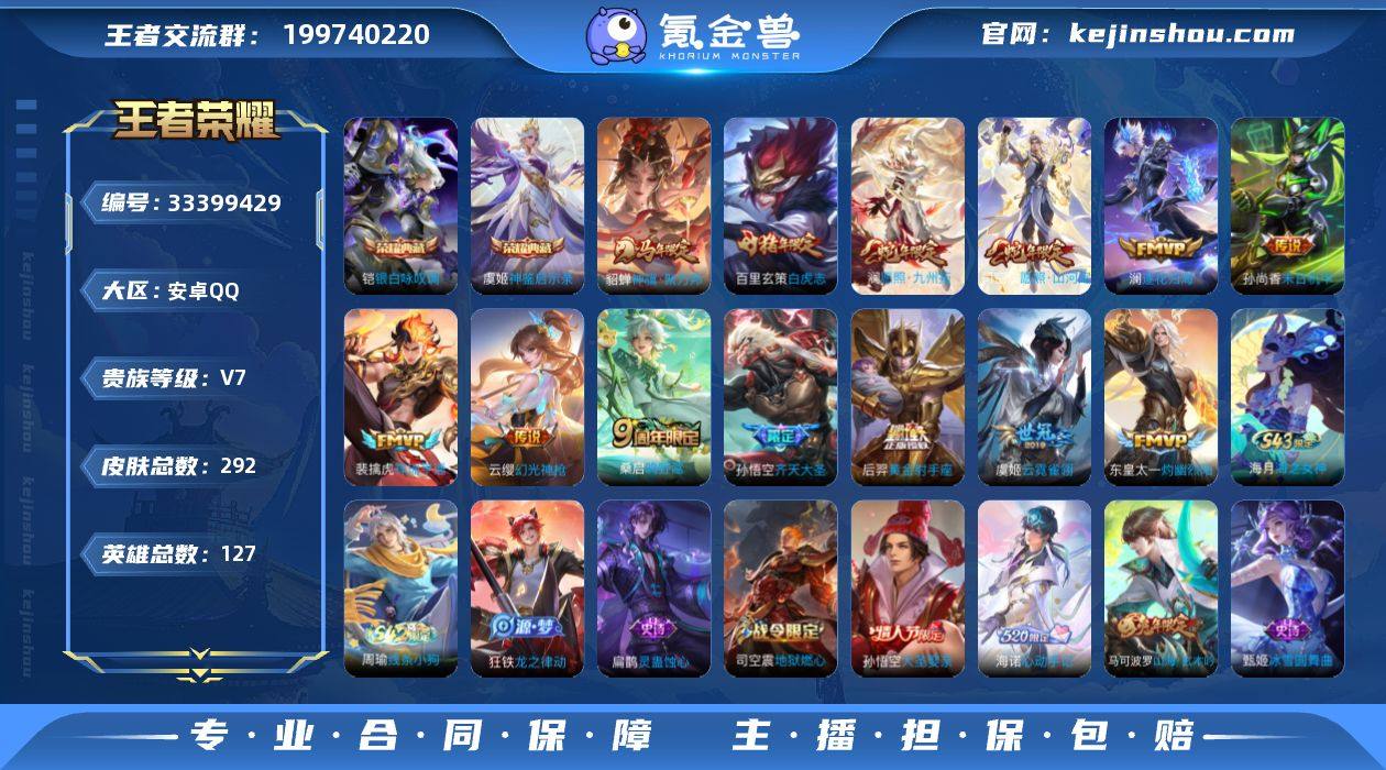 安卓Q-V7-永恒钻石II段位-127英雄-292皮肤-2典藏皮肤-13传说-69史诗 【英雄全皮】:司空震全皮,海诺全皮 【荣耀典藏】:铠银白咏叹调,虞姬神鉴启示录 【传说皮肤】:貂蝉神骥聚万邦,司空震愿照山河定,澜愿照九州拓,云缨幻光神枪,裴擒虎祥瑞亨通,桑启鸣野蒿,澜逐花归海,东皇太一灼幽烈阳,孙悟空齐天大圣,虞姬云霓雀翎,百里玄策白虎志,后羿黄金射手座,孙尚香末日机甲 【限定皮肤】:白起狰,蔡文姬夏日便利店,虞姬夏日便利店,姜子牙天穹之誓,李白谪仙醉月,狄仁杰阴阳师,虞姬凯尔特女王,赵云皇家上将,孙尚香蔷薇恋人,扁鹊奇幻香踪,芈月重明,元歌无心,夏侯惇朔风刀,曹操烛龙,典韦穷奇,马可波罗山海玄木吟,狄仁杰魔术师,狄仁杰万华元夜,项羽海滩派对,老夫子醍醐杖,程咬金演武夺筹,孙悟空大圣娶亲,孙悟空齐天大圣,牛魔御旌,李元芳云中旅人,钟馗驱傩正仪,杨戬潮玩骑兵,女娲朔望之晖,干将莫邪胡桃夹子,鬼谷子五谷丰年,百里玄策白虎志,弈星混沌棋,沈梦溪大漠名商,明世隐疑决卦,裴擒虎擒涛扼浪,狂铁御狮,米莱狄御霄,盾山御銮,上官婉儿梁祝,嫦娥拒霜思,嫦娥暖冬兔眠,西施玲珑珍味,鲁班大师探海日志,桑启海盐诗旅,暃星界游侠,...