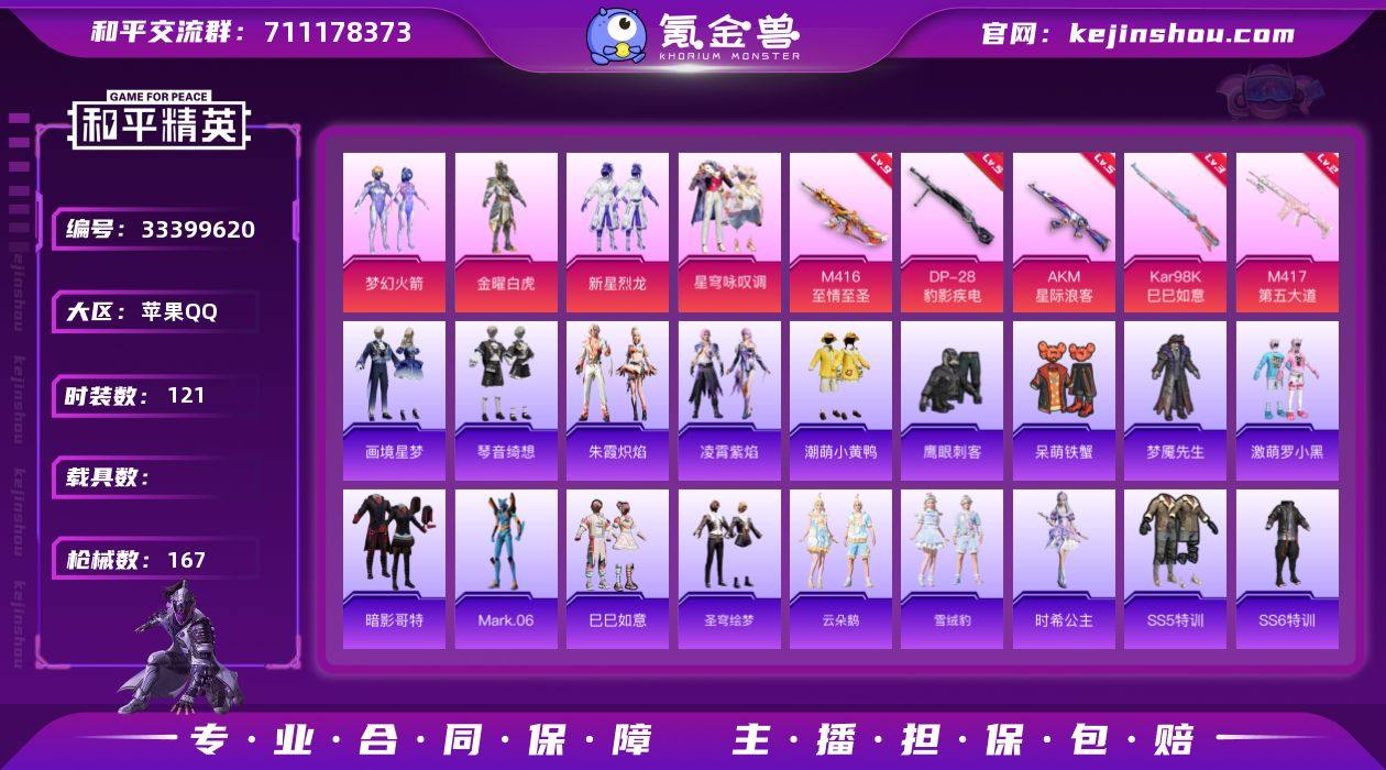 苹果 手Q-4粉装-6特效枪-0载具-0粉色飞行器-49718热力值-2王牌印记-121套装-167枪皮 【热门品类】:粉装-梦幻火箭,套装-潮萌小黄鸭,套装-暗影哥特,角色-Mark.06 【粉色套装】:粉装-金曜白虎,粉装-梦幻火箭,粉装-新星烈龙,粉装-星穹咏叹调 【粉色枪皮等级】:AKM-星际浪客(五级),M416-至情至圣(九级),AKS-74U-森灵之息(五级),Kar98K-巳巳如意(三级),M417-第五大道(二级),DP-28-豹影疾电(五级) 【粉色枪皮】:AKM-星际浪客,M416-至情至圣,AKS-74U-森灵之息,Kar98K-巳巳如意,M417-第五大道,DP-28-豹影疾电 【粉色降落伞】:深海曼妙降落伞,凝视深渊降落伞,碧影闪光降落伞,环太平洋降落伞,太空嘟嘟降落伞,彩虹甜喵降落伞,千金淑猫降落伞,智耀战神降落伞,幻彩电音降落伞,冷漠罗丽降落伞 【稀有套装】:套装-巳巳如意,套装-圣穹绘梦,套装-云朵鹅,套装-雪绒豹,角色-时希公主,套装-朱霞炽焰,套装-凌霄紫焰,套装-画境星梦,套装-琴音绮想 【稀有枪皮】:AKM-生命誓言,AKM-破晓战魂,AKM-虎虎生威,AKM-霓虹街区,AKM-龙的传人,M16A4-幻世战舞者,SCAR-L-玉兔迎春,SCAR-L-生命誓言,SCAR-L-黄金龙骨,SCAR-L-冷漠罗丽,M416-蓝色火焰,GROZA-异彩先...