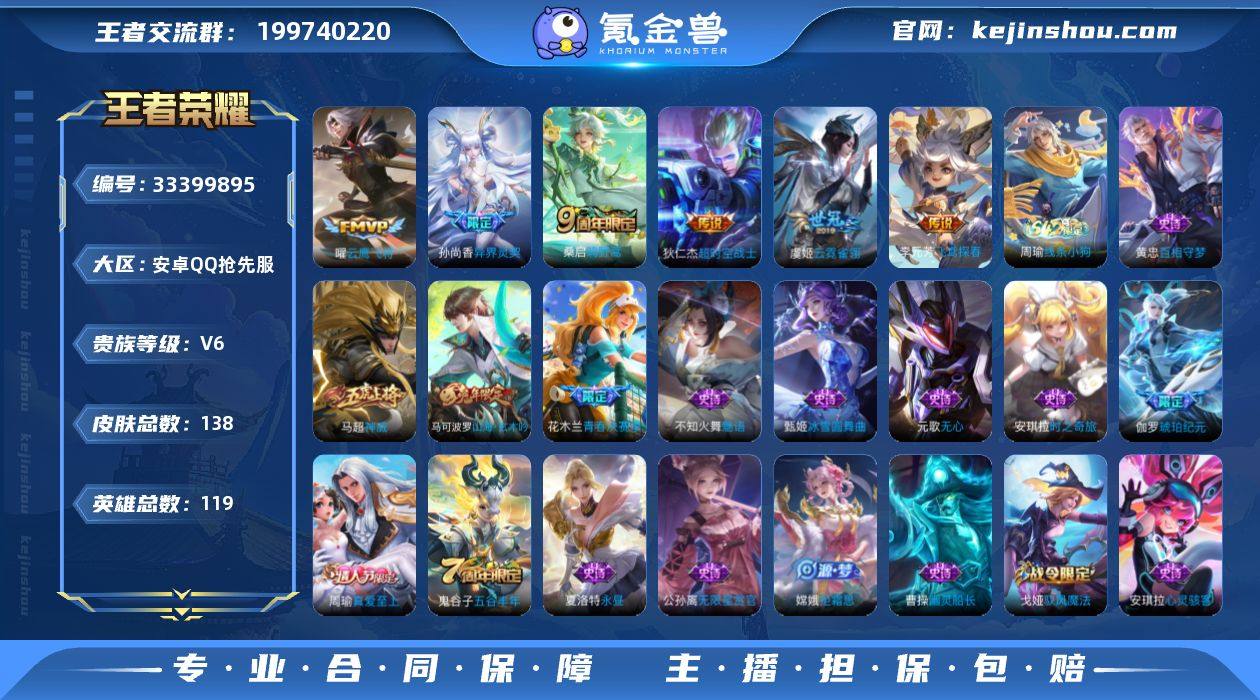 无二次-安卓Q抢先服【7小国/12金标】-尊贵铂金IV段位-119英雄-138皮肤-6传说-45史诗 【传说皮肤】:桑启鸣野蒿,孙尚香异界灵契,李元芳飞鸢探春,曜云鹰飞将,虞姬云霓雀翎,狄仁杰超时空战士 【限定皮肤】:狄仁杰阴阳师,赵云皇家上将,孙尚香蔷薇恋人,孙尚香异界灵契,庄周高山流水,周瑜真爱至上,元歌无心,马可波罗山海玄木吟,狄仁杰魔术师,达摩沙漠行僧,项羽海滩派对,兰陵王金庭之子,花木兰青春决赛季,后羿圣弓游侠,李元芳云中旅人,干将莫邪真爱魔法,雅典娜黎明之约,太乙真人华丽摇滚,鬼谷子五谷丰年,苏烈千军破阵,梦奇顽趣,沈梦溪大漠名商,裴擒虎擒涛扼浪,嫦娥拒霜思,西施玲珑珍味,鲁班大师探海日志,桑启海盐诗旅,戈娅驭风魔法,张良古海寻踪,蒙恬荣光圣徽,鬼谷子天穹祈灯,伽罗琥珀纪元,沈梦溪龙舞盛年,鲁班七号蔬乡物语,李元芳蔬乡物语 【年限皮肤】:马可波罗山海玄木吟 【赛季限定】:苏烈千军破阵,达摩沙漠行僧,兰陵王金庭之子,沈梦溪大漠名商,李元芳云中旅人,桑启海盐诗旅,裴擒虎擒涛扼浪,鲁班大师探海日志,张良古海寻踪,鬼谷子天穹祈灯,甄姬逆浪荇歌,雅典娜黎明之约,梦奇顽趣,蒙恬荣光圣徽 【战令限定】:干将莫邪真...