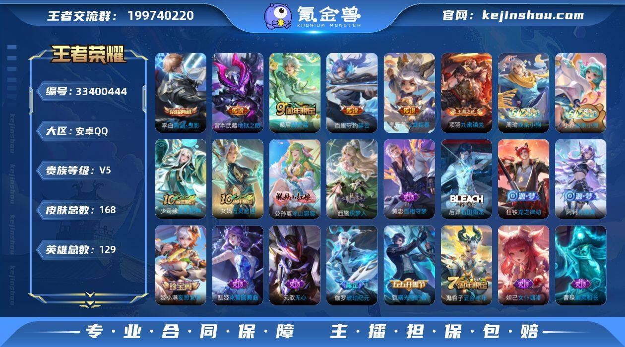 贵族等级5/荣耀典藏数量1/传说皮肤数量5/史诗皮肤数量53/皮肤数量168/英雄数量129/段位最强王者/金标百里守约/孙权全皮/敖隐全皮/鸣剑·曳影/云缨神骥越千峰/鸣野蒿/碎云/飞鸢探春/地狱之眼/蒙犽顽岩魄/大乔绒语心约/天穹之誓(s36)/阴阳师/皇家上将/蔷薇恋人/超时空战士-钟无艳/无心/落雪兰心/海滩派对/云中旅人(s29)/五谷丰年/原初追遂者/顽趣-梦奇/大漠名商(s28)/擒涛扼浪(s31)/梁祝/探海日志(s32)/海盐诗旅(s30)/江河有灵/古海寻踪(s33)/蒙恬荣光圣徽/鬼谷子天穹祈灯(S34)/琥珀纪元伽罗/妄想食味/龙武盛年/剑破天穹(s35)/程咬金群星魔术团/青焰无极/苍威无极/熔金海岸/噬灭天穹(s37)/虚灵犬护/逆浪荇歌/荣光之誓/星界战将/九幽镇关/线条小狗-周瑜/线条小狗-小乔/海月海之女神/明世隐百晓客/巫礼祀神/万灵启世/罗小黑战记/涂山容容/织梦人/百相守梦-黄忠/石田雨龙/龙之律动/化蝶舞/真我赫兹(百里守约)/唤灵魅影/鹰眼统帅/猫狗日记-孙策/星夜王子/功夫厨神/逐浪之夏/天才门将/曙光守护者/特工魅影/心灵骇客/心灵战警/黄金分割率/暗隐猎兽者/乘风破浪/末日机甲-吕布/千年之狐/幽灵船长/圣诞狂欢/金属风暴/女仆咖啡/魅力维加斯/水果甜心/鬼剑武藏/偶像歌手/冰雪圆舞曲/兰陵王雾...