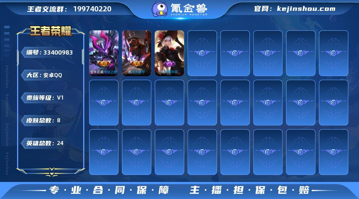 JJ4563:安卓Q打野号-V0-荣耀黄金II-24英雄-8皮肤-2传说-1史诗 【稀有英雄】 韩信 【传说皮肤】 地狱之眼 绛天战甲 【限定皮肤】 地狱之眼 【史诗皮肤】 玫瑰异探 【勇者皮肤】 掌控之力 龙腾万里 万象初新 【其他皮肤】 启蛰