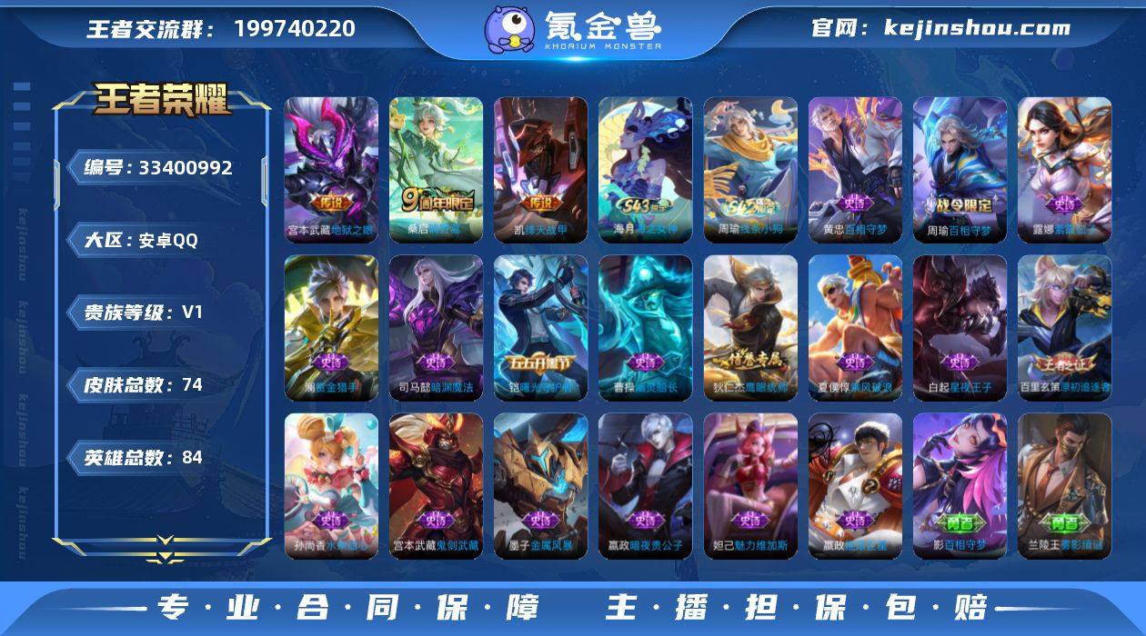 安卓Q-V0-至尊星耀V段位-84英雄-74皮肤-3传说-17史诗 【英雄全皮】:影全皮 【传说皮肤】:桑启鸣野蒿,铠绛天战甲,宫本武藏地狱之眼 【限定皮肤】:姜子牙天穹之誓,狄仁杰阴阳师,百里玄策原初追逐者,沈梦溪龙舞盛年 【赛季限定】:姜子牙天穹之誓,东皇太一噬灭天穹,钟馗虚灵犬护,甄姬逆浪荇歌,亚瑟荣光之誓,百里玄策原初追逐者 【战令限定】:周瑜百相守梦,孙策百相守梦,周瑜线条小狗 【史诗皮肤】:海月海之女神,周瑜线条小狗,黄忠百相守梦,周瑜百相守梦,澜赏金猎手,司马懿暗渊魔法,百里玄策原初追逐者,狄仁杰鹰眼统帅,白起星夜王子,铠曙光守护者,夏侯惇乘风破浪,曹操幽灵船长,墨子金属风暴,妲己魅力维加斯,嬴政摇滚巨星,嬴政暗夜贵公子,孙尚香水果甜心,宫本武藏鬼剑武藏,露娜紫霞仙子 【其他皮肤】:影百相守梦,兰陵王雾影缉谜,鲁班七号班班快跑,蚩奼极光幻客,亚瑟荣光之誓,哪吒罗小黑战记,鬼谷子克喵,莱西奥踏浪烽翎,孙策百相守梦,云中君云械蓝图,甄姬逆浪荇歌,白起死霸装,露娜命运加冕,张良灵野札记,苏烈春野闲踪,钟馗虚灵犬护,影魅影绮裳,典韦铁骨偃魂,苍苍林狼骑,东皇太一噬灭天穹,盘古敬我三分,姜子牙天穹之誓,大...