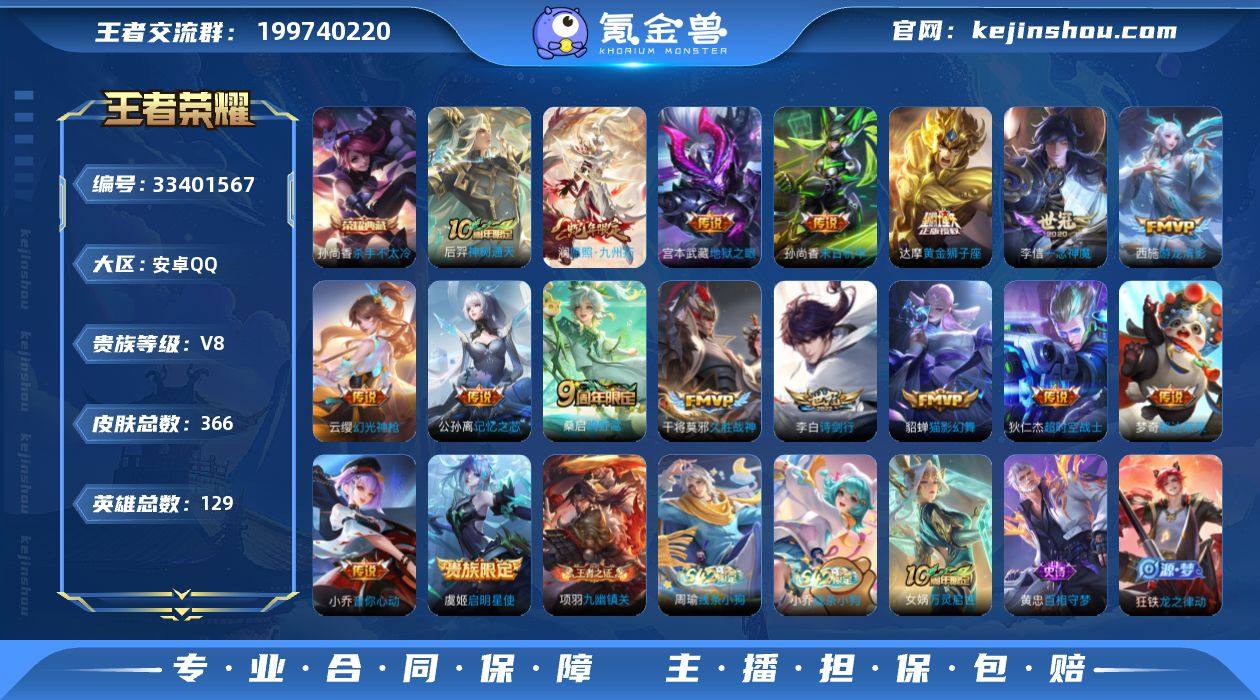 贵族等级8/荣耀典藏数量2/传说皮肤数量17/史诗皮肤数量126/皮肤数量366/英雄数量129/段位永恒钻石/孙权全皮/敖隐全皮/影全皮/杀手不太冷/安琪拉颠倒童话魔镜/神树通天/愿照·九州拓/幻光神枪/鸣野蒿/记忆之芯/诗剑行/游龙清影/音你心动-小乔/启明星使/一念神魔/猫影幻舞/久胜战神/黄金狮子座/胖达荣荣/末日机甲-孙尚香/地狱之眼/超时空战士-狄仁杰/埋骨钱/蔡文姬夏日便利店/虞姬夏日便利店/天穹之誓(s36)/阴阳师/皇家上将/神迹守卫-墨子/乒乒小将/高山流水/玩趣恶龙/超时空战士-钟无艳/夜都怪侠/白晶晶/幻夜卜梦/猎兽之王/云间偶戏/无心/游园惊梦/落雪兰心/山海·玄木吟/魔术师/万华元夜(s22)/星际陆战队-达摩/沙漠行僧(s26)/海滩派对/醍醐杖(s20)/航海奇遇记/演武夺筹(s23)/傲雪梅枪/金庭之子(s27)/潮玩骑士王/孙行者/圣弓游侠/匿光侦查者/云中旅人(s29)/驱傩正仪(s24)/遇见飞天/冰霜恋舞曲/真爱魔法/黎明之约/原初探秘者(s21)/五谷丰年/火炮绅士/千军破阵(s25)/原初追遂者/顽趣-梦奇/蜜橘之夏/玉兔公主/大漠名商(s28)/匿光破解者/疑决卦(s19)/吟游魔法/李小龙/擒涛扼浪(s31)/胡桃异想国/纤云弄巧/时之祈愿-云中君/如梦令-嫦娥/暖冬·兔眠/玲珑珍味/探海日志(s32)/海盐诗旅(s30)...