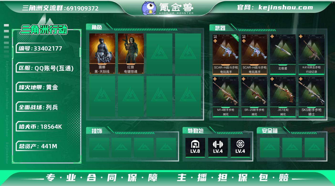 【SJ9973】总资产441M/哈夫币1856万/传说近战数1/传说枪皮数29/战场等级39/行动等级60/安全箱等时效性道具以游戏内数据为准,详情请看图/露娜-黑·天际线/红狼-电锯惊魂/近战-北极星/近战-黑鹰/SCAR-H战斗步枪-电玩高手/优品C典藏武器外观-SCAR-H战斗步枪-电玩高手/M4A1突击步枪-阿米娅/ASh-12战斗步枪-鹅鸭杀/K416突击步枪-行动记录/AK-12突击步枪-特斯拉线圈/SCAR-H战斗步枪-启航/G3战斗步枪-骑士/CAR-15突击步枪-阿米娅/AS Val突击步枪-蛇年祥瑞/腾龙突击步枪-捞点薯条/K437突击步枪-北极星/KC17突击步枪-电锯惊魂/P90冲锋枪-神秘艺术/UZI冲锋枪-特斯拉线圈/SMG45冲锋枪-骑士/SR-3M紧凑突击步枪-特斯拉线圈/勇士冲锋枪-能天使-午夜邮差/QCQ171冲锋枪-北极星/QCQ171冲锋枪-鹅鸭杀/M250通用机枪-几何解构/QJB201轻机枪-鹅鸭杀/M14射手步枪-缄花/SKS射手步枪-骑士/SR-25射手步枪-水墨云图/SR-25射手步枪-缄花/AWM狙击步枪-捞点薯条/.357左轮-缄花/93R-捞点薯条/复合弓-黑-天际线/P90冲锋枪-暗鸦(典藏)/AUG突击步枪-天命(典藏)/PTR-32突击步枪-碎冰行动(典藏)/SVD狙击步枪-檀劫铳影/AKM突击步枪-林中猎手/QBZ95-1突击步枪-曙光/K416突击步枪-竞技风/K416突击步枪-冬日风情/K416...