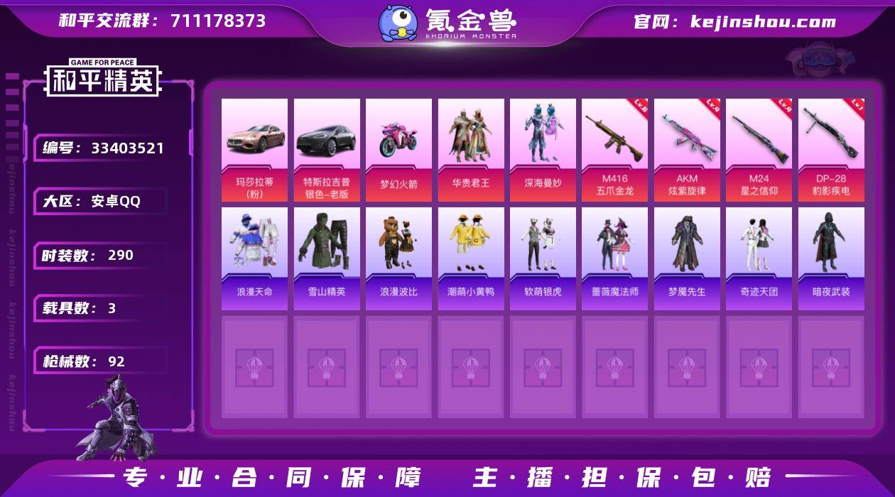 【特价出售】安卓Q-1稀有3载具2粉装4特效枪17热门65套装92枪皮 33131热力值 4印记 历史超级王牌2星 【1稀有】 浪漫天命 【3载具】 玛莎拉蒂粉色 特斯拉X银色 双人摩托梦幻火箭 【2粉装】 深海曼妙 华贵君王 【4特效枪】 M416-五爪金龙 (6级) M24-星之信仰 (4级) AKM-炫紫旋律 (4级) DP-28-豹影疾电 (1级) 【17热门】 奇迹天团 星光纪元 雪山精英 潮萌小黄鸭 梦魇先生 暗夜武装 软萌银虎 蔷薇魔法师 奇迹天团 浪漫波比 软嫩糖心蛋 黑色刀锋 M416-魔法学院 M762-奇异狩猎者 M762-潮萌小黄鸭 M249-古堡领主 AUG-魔法学院 【2飞行器】 梦幻火箭飞行器 星之信仰飞行翼 【3头盔】 梦幻火箭头盔 水曜玄武头盔 潮萌小黄鸭头盔 【6背包】 银河战甲背包 精灵迷巫背包 梦幻火箭背包 金风玉露背包 潮萌小黄鸭背包 神秘黑猫背包