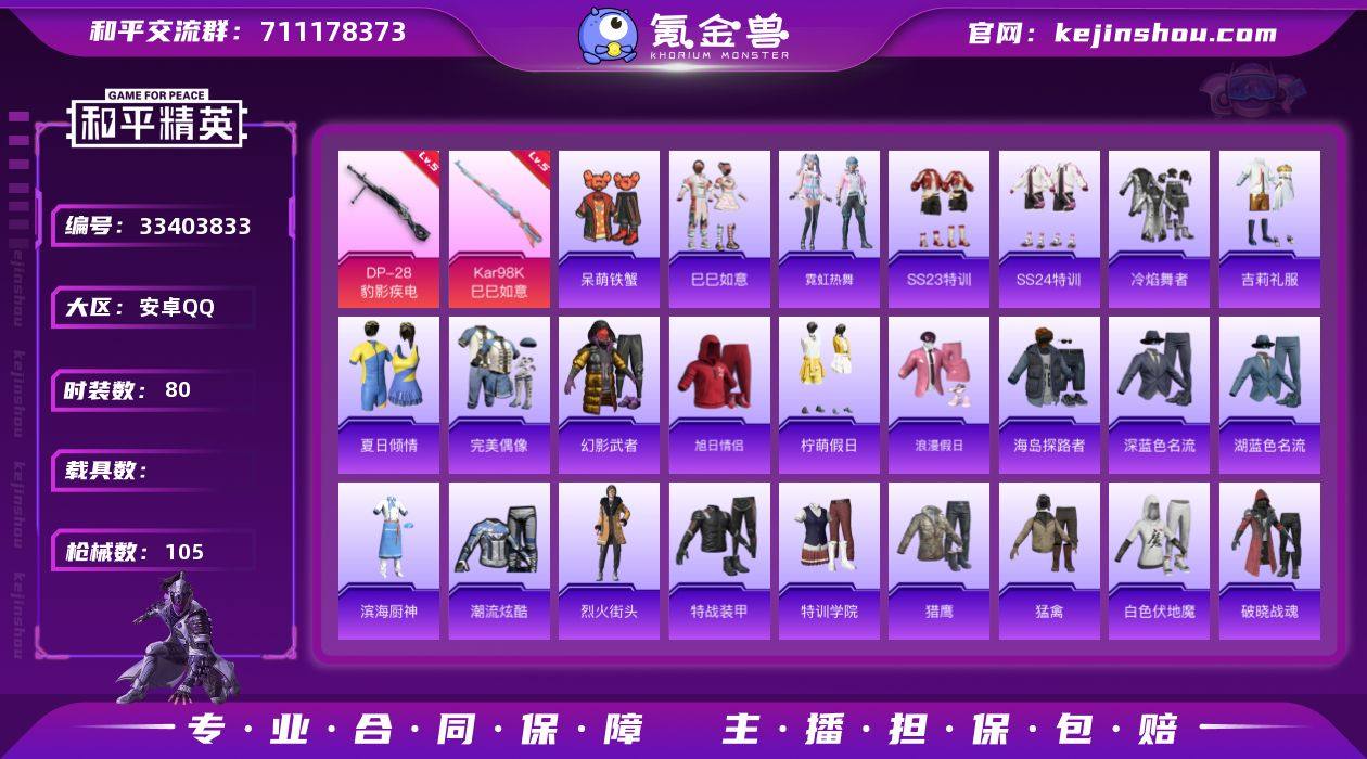 安卓 手Q-1粉装-4特效枪-0载具-2粉色飞行器-27230热力值-1王牌印记-80套装-105枪皮 【粉色套装】:角色-鸢尾珑雾 【粉色枪皮等级】:UMP45-萌骑冒险(四级),Kar98K-巳巳如意(五级),Mk14-福马献瑞(四级),DP-28-豹影疾电(五级) 【粉色枪皮】:UMP45-萌骑冒险,Kar98K-巳巳如意,Mk14-福马献瑞,DP-28-豹影疾电 【粉色飞行器】:炫彩糖果飞行器,极意拳锋飞行器 【粉色降落伞】:幻影战神降落伞,春暖花开降落伞,星穹咏叹调降落伞,炫彩糖果降落伞 【稀有套装】:套装-巳巳如意,套装-雪国风尚,套装-炫彩糖果,套装-马上有钱,套装-迅捷龙虾,套装-霓虹热舞,角色-霜刃之御,套装-雨过天青,套装-红釉青花 【稀有枪皮】:AUG-冰晶雪宝,AKM-彩虹符号,AKM-影袭,AKM-破晓战魂,AKM-龙的传人,SCAR-L-夜灯,SCAR-L-红色方程式,M416-糯团青竹,M416-红色方程式,M416-蓝色火焰,AUG-天降萌叽,AUG-耀粉歌者,AUG-绝对恒星,QBZ-彩虹符号,M762-天降萌叽,AC-VAL-天降萌叽,蜜獾-天降萌叽,UZI-啾咪啾咪,UZI-红色方程式,UMP45-夜灯,UMP45-生命誓言,UMP45-蓝色火焰,汤姆逊-天降萌叽,汤姆逊-幻影战神,汤姆逊-炫彩节奏,汤姆逊-耀粉歌者,汤姆逊-像素花束,P90-巳巳如意,K...
