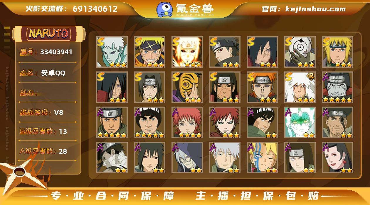 【编号14795 可秒换绑】【店长推荐!极品火影号!7级霸体!带有蛞蝓,还有新出的十尾人柱力带土和解斑,还有侠隐药师兜,像死二和马斑都是差几片碎片就出来了,忍法帖已经开启,买到就是赚到晚了就是别人的了!!】 13S级忍者数-28A级忍者数 【S级忍者】:千手柱间「秽土转生」(3星),宇智波斑「秽土转生」(3星),宇智波斑「秽土转生·解」(3星),宇智波鼬「须佐能乎」(3星),宇智波止水「须佐能乎」(3星),自来也「舞之豪杰」(3星),波风水门(3星),神秘面具男(3星),佩恩「天道」(3星),宇智波斑 「白面具」(3星宇智波斑「白面具」),波风水门「九喇嘛连结」(3星),漩涡鸣人·宇智波佐助(3星),宇智波带土「十尾人柱力」(3星) 【A级忍者】:波风水门「青年」(2星),大蛇丸「晓」(2星),飞段(2星),飞段「死司凭血」(2星),干柿鬼鲛(5星),漩涡博人「桃式显现」(2星),漩涡鸣人「仙人模式」(2星),迈特凯(5星),旗木卡卡西「幻之真容」(2星),旗木卡卡西「神威对决」(2星),桃地再不斩「秽土转生」(2星),我爱罗「疾风传」(3星),蝎(4星),猿飞阿斯玛(5星),宇智波鼬(2星),宇智波佐助「须佐能乎」(2星),宇智波佐助「疾风传咒印」(2星),宇智波佐助「万花筒写轮眼」(2星),药...