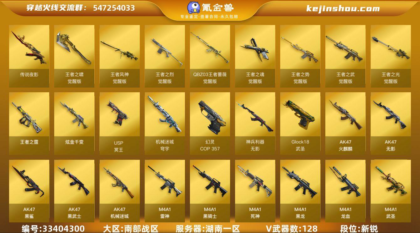 湖南一区-152V-12王者武器数-1炫金武器数 【传说武器】:传说夜影 【传说角色】:传说星骇,传说艾莉莎 【热门武器】:传说夜影,QBZ03-金色蔷薇,M4A1-青龙,M200-幻神*10,M200-竞技荣光,Kar98K-星神,金色小号,Cat-刀锋,炼狱-迷你小钢*3,牛牛-AK47,M4A1-黑骑士*4,汤姆逊-烈龙*6,加特林-炼狱,金色蔷薇-空,毁灭-孙三炮*2,COP-白鲨,COP 357-幻灵*2,沙鹰-修罗*7,Knife-冠军之刃*2,炽芒蝶刃*3,黄金猫猫手套-白鲨,金刚伞*4 【王者炫金武器】:王者之霆,炫金千变 【音效卡】:天神-动感闪耀 音效卡,M200-幻神音效卡,Barrett-极光音效卡*2,AWM-裁决音效卡,Scar Light-白虎音效卡,火线妹语音包 【皮肤】:幻神-周瑜皮肤,幻神-冠军之幻,幻神-青鹤,幻神-巅峰荣耀,幻神-CFS2022,M200-幻神-荣耀世冠白鲨,幻神-动感闪耀 皮肤,白虎-大汉风骨,白虎-霓虹机甲 皮肤,QBZ03-AG-CFPLS19冠军,QBZ03-荣耀世冠白鲨,QBZ03-巅峰荣耀皮肤,金色蔷薇-破浪逐光 皮肤,QBZ03-嘉年华柯基,裁决-运输船 皮肤,星神-漫游,Kar98K-星神-冠军之星皮肤,雷神-暗月,雷神-荣耀之魄,雷神-耀金皮肤,雷神-宠儿-2019MVP,雷神-R.LGD-CFPLS18冠军*2,雷神-脉冲核心,雷神-动感闪耀...