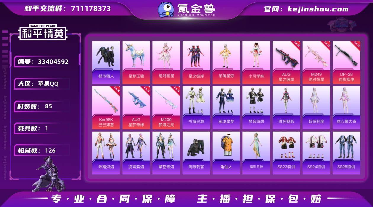 【kyhp1911】苹果 手Q-4粉装-8特效枪-1载具-4粉色飞行器-39389热力值-6王牌印记-85套装-126枪皮 【热门品类】:套装-都市猎人,套装-龟仙人 【粉色套装】:角色-绝对恒星,粉装-星之彼岸,角色-呆萌星弥,角色-小可学妹 【粉色枪皮等级】:AUG-星之彼岸(六级),AUG-星梦奇缘(三级),AKS-74U-森灵之息(五级),Kar98K-巳巳如意(五级),Mk14-福马献瑞(五级),M200-梦海之灵(三级),M249-绝对恒星(七级),DP-28-豹影疾电(五级) 【粉色载具】:星梦玉骢 【粉色枪皮】:AUG-星之彼岸,AUG-星梦奇缘,AKS-74U-森灵之息,Kar98K-巳巳如意,Mk14-福马献瑞,M200-梦海之灵,M249-绝对恒星,DP-28-豹影疾电 【粉色飞行器】:绝对恒星飞行器,香车宝马飞行器,炫彩糖果飞行器,幻海精灵飞行器 【粉色降落伞】:绝对恒星降落伞,星之彼岸降落伞,白勺歌姬降落伞,沙丘之主降落伞,星梦奇缘降落伞,忍者神龟降落伞,冷漠罗丽降落伞,喜羊羊与灰太狼降落伞,炫彩糖果降落伞 【稀有套装】:套装-龟仙人,角色-超感刻度,角色-甜心蒙太奇,套装-雪国风尚,套装-炫彩糖果,套装-马上有钱,套装-迅捷龙虾,套装-遗迹猎人,角色-猎影月神,套装-朱霞炽焰,套装-凌霄紫焰,套装-擎苍青焰,角色-绯色...