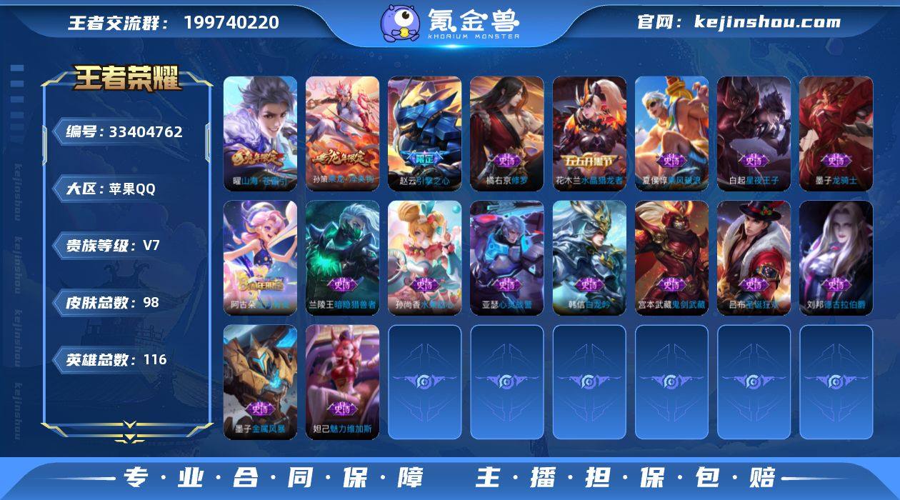 V7 1珍品传说 6传说 116英雄 98皮肤 可二次 可修改实名 男号