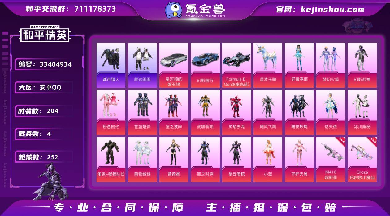 【kyhp1908】安卓 手Q-19粉装-15特效枪-4载具-6粉色飞行器-91797热力值-9王牌印记-204套装-252枪皮 【热门品类】:粉装-梦幻火箭,套装-浪漫天命,套装-都市猎人,套装-小丑鱼,套装-胖达圆圆,套装-忍者信条,角色-2B战斗服款,角色-2P战斗服款,套装-龟仙人,套装-暗影哥特,套装-浪漫波比,套装-粉红小猪,角色-8号机,角色-Mark.06,熔岩游骑兵连帽夹克 【粉色套装】:粉装-幻影战神,粉装-粉色回忆,粉装-梦幻火箭,粉装-苍蓝魅影,粉装-星之彼岸,粉装-虎啸骄阳,粉装-炙焰赤龙,粉装-飓风飞鹰,粉装-暗夜玫瑰,角色-洛天依,粉装-冰川幽秘,角色-猩猩队长,粉装-萌物绒绒,角色-蔷薇星,角色-宙之时溯,角色-星云暗核,角色-小蓝,角色-守护天翼,角色-异瞳寒姬 【粉色枪皮等级】:SCAR-L-锦绣绵绵(五级),M416-心之恋语(四级),M416-超新星(六级),GROZA-巴啦啦小魔仙(六级),AUG-星之彼岸(五级),M762-激战未来(五级),蜜獾-异瞳寒姬(五级),UMP45-量子极限(五级),AKS-74U-森灵之息(五级),Kar98K-巳巳如意(五级),Mk14-樱桃泡泡(五级),AMR-炫光之旅(四级),M249-猪猪侠(四级),DP-28-豹影疾电(五级),MG3-洛神天依(四级) 【粉色载具】:星河领航(磐石银),幻影...