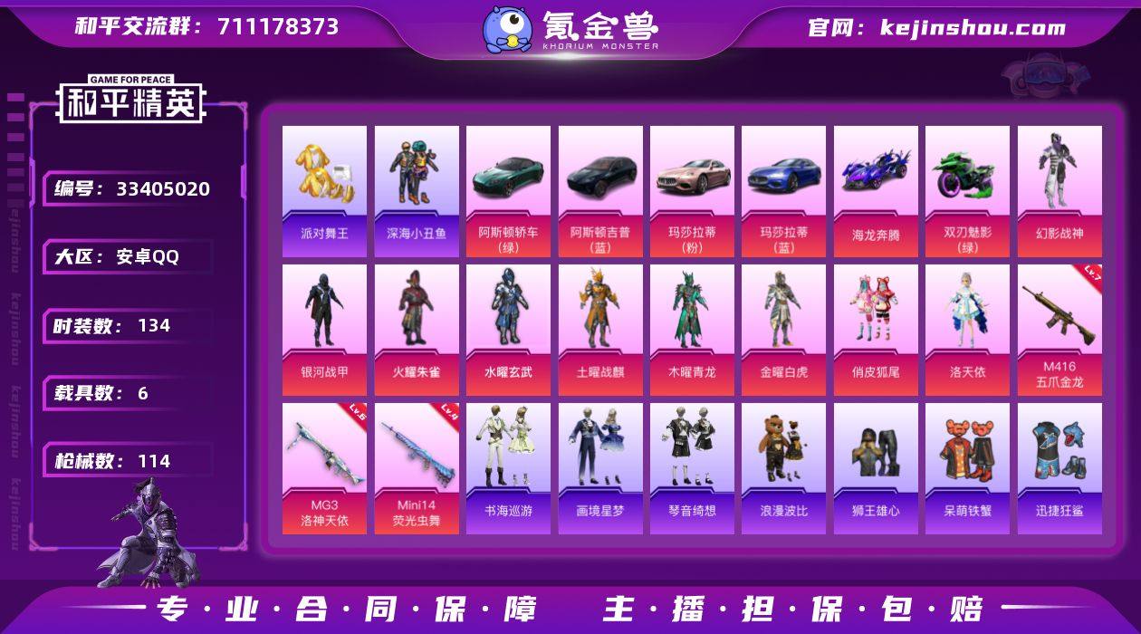 【kyhp1864】安卓 手Q-9粉装-6特效枪-6载具-3粉色飞行器-55706热力值-3王牌印记-134套装-114枪皮 【热门品类】:套装-浪漫天命,套装-派对舞王,套装-深海小丑鱼,套装-小丑鱼,套装-忍者信条,旭日初心兜帽大衣,套装-暗影哥特,套装-浪漫波比,套装-粉红小猪 【粉色套装】:粉装-幻影战神,粉装-银河战甲,粉装-火曜朱雀,粉装-水曜玄武,粉装-土曜战麒,粉装-木曜青龙,粉装-金曜白虎,粉装-俏皮狐尾,角色-洛天依 【粉色枪皮等级】:M416-五爪金龙(七级),AKS-74U-森灵之息(五级),Mini14-荧光虫舞(四级),Mk14-福马献瑞(五级),MG3-洛神天依(六级),PKM-萌骑夺宝(一级) 【粉色载具】:阿斯顿马丁DBS(绿),阿斯顿马丁DBX(蓝),玛莎拉蒂Ghibli(粉),玛莎拉蒂Ghibli(蓝),海龙奔腾,双人摩托-双刃魅影(绿) 【粉色枪皮】:M416-五爪金龙,AKS-74U-森灵之息,Mini14-荧光虫舞,Mk14-福马献瑞,MG3-洛神天依,PKM-萌骑夺宝 【粉色飞行器】:春暖花开飞行器,阿狸红飞行器 【粉色降落伞】:极限特训降落伞,幻影战神降落伞,银河战甲降落伞,荧光虫舞降落伞,阿狸红降落伞,夏日绵绵冰降落伞,洛神天依降落伞,虎痴许褚降落伞 【稀有套装】:套装-顽皮橙,套装-马上有...