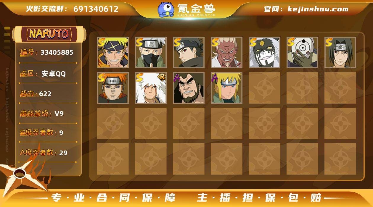 93912|安卓QQ 3933区 622w战力 v9 S忍者数:9 A忍者数:29 时装8安卓QQ 3933区 S忍者数:9 A忍者数:29 忍者:漩涡鸣人·宇智波佐助,旗木卡卡西「须佐能乎」,宇智波止水「须佐能乎」,艾「忍界大战」,大筒木桃式,自来也「舞之豪杰」,宇智波斑「白面具」,宇智波鼬「须佐能乎」,佩恩「天道」,小南「神驹佑将」,迈特凯「青春爆炸」,巳月「仙人模式」,机械鸣人「初始形态」,神农「羁绊」,宇智波泉奈,李洛克「忍界大战」,药师兜「侠隐江湖」,旗木卡卡西「幻之真容」,日向雏田「最终章」,漩涡博人「桃式显现」,不缘,长十郎「六代目水影」,达鲁伊「五代目雷影」,波风水门「青年」,黑土「四代目土影」,旗木卡卡西「忍界大战」,千代「近松十人卫」,我爱罗「忍界大战」,大蛇丸「晓」,飞段「死司凭血」,迪达拉,我爱罗「疾风传」,蝎,干柿鬼鲛,宇智波鼬,猿飞阿斯玛,桃地再不斩,迈特凯,佩恩「畜生道」,重吾「忍界大战」,日向花火「武当宗师」,佩恩「地狱道」,雨琉「羁绊」,佐井「最终章」,御手洗红豆「新春限定」,月光疾风「秽土转生」,马基,佩恩「饿鬼道」,犬塚花,奈良鹿丸「最终章」,佩恩「人间道」,大和「新春限定」,贰「火之意志继承者」,日向雏田「忍者之路」,春野樱「忍者少女」,枫「七尾人柱...