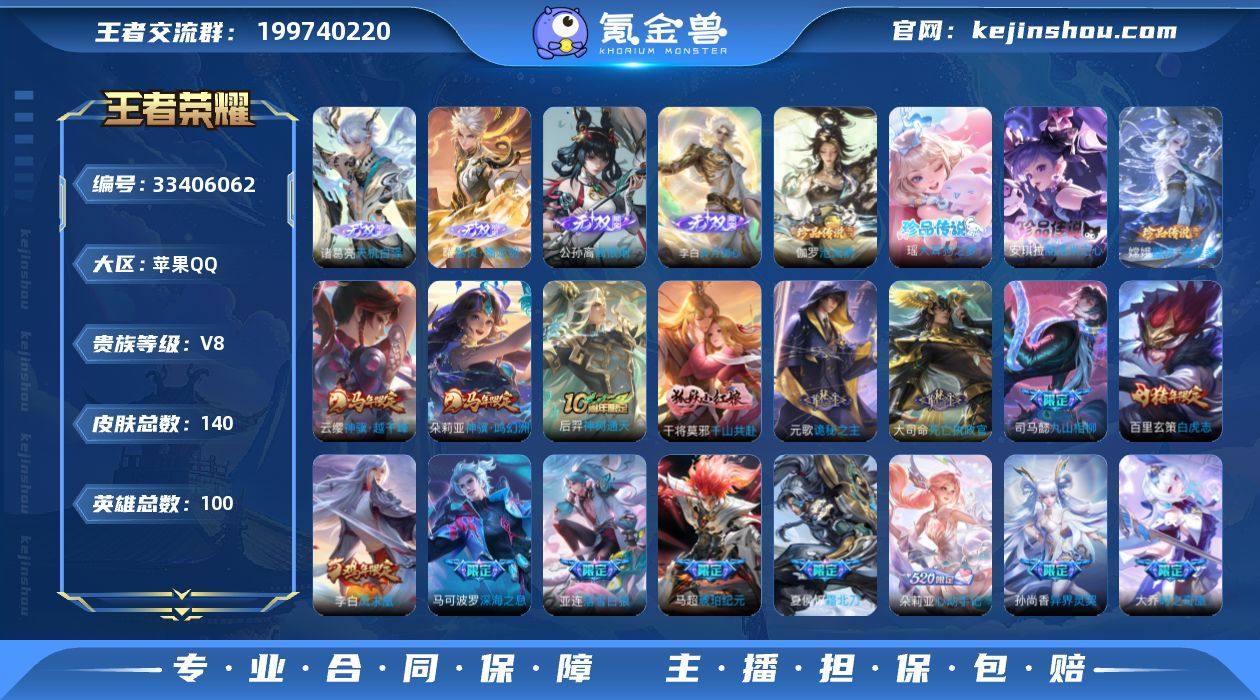 苹果Q-V8-永恒钻石III段位-100英雄-140皮肤-4无双-4珍品传说-19传说-46史诗 【英雄全皮】:司马懿全皮,孙权全皮,朵莉亚全皮,大司命全皮,空空儿全皮,少司缘全皮 【无双皮肤】:诸葛亮天机白泽,曜器灵螭龙剑,公孙离离恨烟,李白碎月剑心 【珍品传说】:伽罗沧流箭,安琪拉酷洛米之心,瑶大耳狗之梦,嫦娥器灵落星盏 【传说皮肤】:云缨神骥越千峰,朵莉亚神骥鸣幻洲,后羿神树通天,干将莫邪千山共赴,元歌诡秘之主,大司命死亡执政官,司马懿九山相柳,夏侯惇霜北刀,朵莉亚心动手记,亚连落雪白狼,马超琥珀纪元,大乔时之奇旅,干将莫邪画中仙,马可波罗深海之息,孙尚香异界灵契,虞姬启明星使,百里玄策白虎志,貂蝉仲夏夜之梦,李白凤求凰 【限定皮肤】:公孙离离恨烟,夏侯惇霜北刀,虞姬夏日便利店,狄仁杰阴阳师,赵云皇家上将,妲己时之彼端,妲己时之奇旅,孙尚香异界灵契,芈月白晶晶,马可波罗深海之息,狄仁杰魔术师,项羽海滩派对,露娜一生所爱,孙悟空大圣娶亲,虞姬启明星使,杨玉环遇见飞天,杨玉环寅虎心曲,干将莫邪画中仙,蔡文姬奇迹圣诞,大乔白鹤梁神女,大乔时之奇旅,百里玄策白虎志,瑶山海碧波行,西施玲珑珍味,西施至美乘鲤谣,艾琳流音...