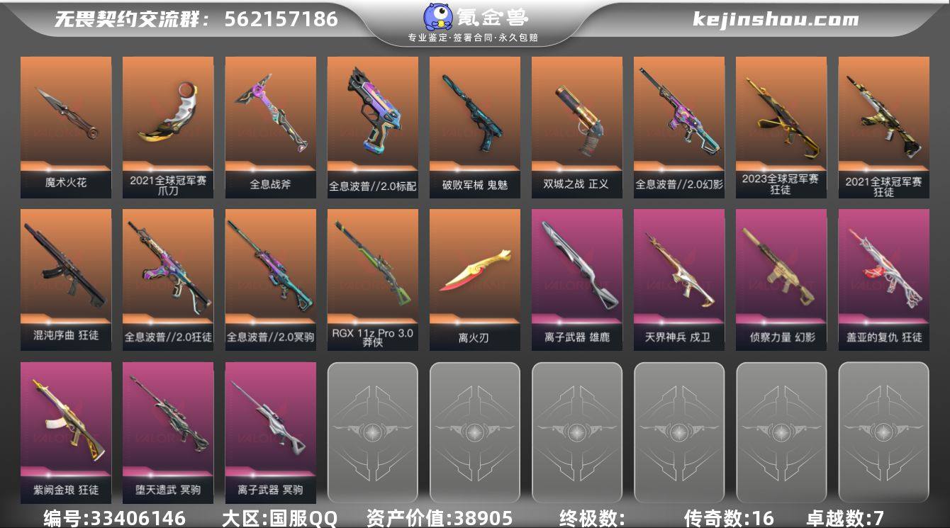 段位: 超凡 亮点皮肤: 离火刃,正义-双城之战,狂徒-2023全球冠军赛,狂徒-2021全球冠军赛,爪刀-2021全球冠军赛 近战武器皮肤: 全息战斧-全息波普//2.0,魔术火花-奇幻朋克3.0 步枪皮肤: 狂徒-紫阙金琅,狂徒-盖亚的复仇,幻影-侦察力量,戍卫-天界神兵,幻影-全息波普//2.0,狂徒-全息波普//2.0,狂徒-混沌序曲 佩枪皮肤: 鬼魅-破败军械,标配-全息波普//2.0 狙击枪皮肤: 冥驹-堕天遗武,冥驹-离子武器,冥驹-全息波普//2.0,莽侠-RGX 11z Pro 3.0 霰弹枪皮肤: 雄鹿-离子武器 亮点: 【充值总皮肤】: 魔术火花, 天界神兵 戍卫, 混沌序曲 狂徒, RGX 11z Pro//3.0 莽侠, 全息波普//2.0 标配, 全息波普//2.0 幻影, 全息波普//2.0 狂徒, 全息波普//2.0 冥驹, 全息战斧, 离子武器 冥驹, 离子武器 雄鹿, 堕天遗武 冥驹, 2021全球冠军赛 爪刀, 2021全球冠军赛 狂徒, 破败军械 鬼魅, 侦察力量 幻影, 盖亚的复仇 狂徒, 2023全球冠军赛 狂徒, 双城之战 正义, 合金战车 军刀, 紫阙金琅 狂徒, 离火刃