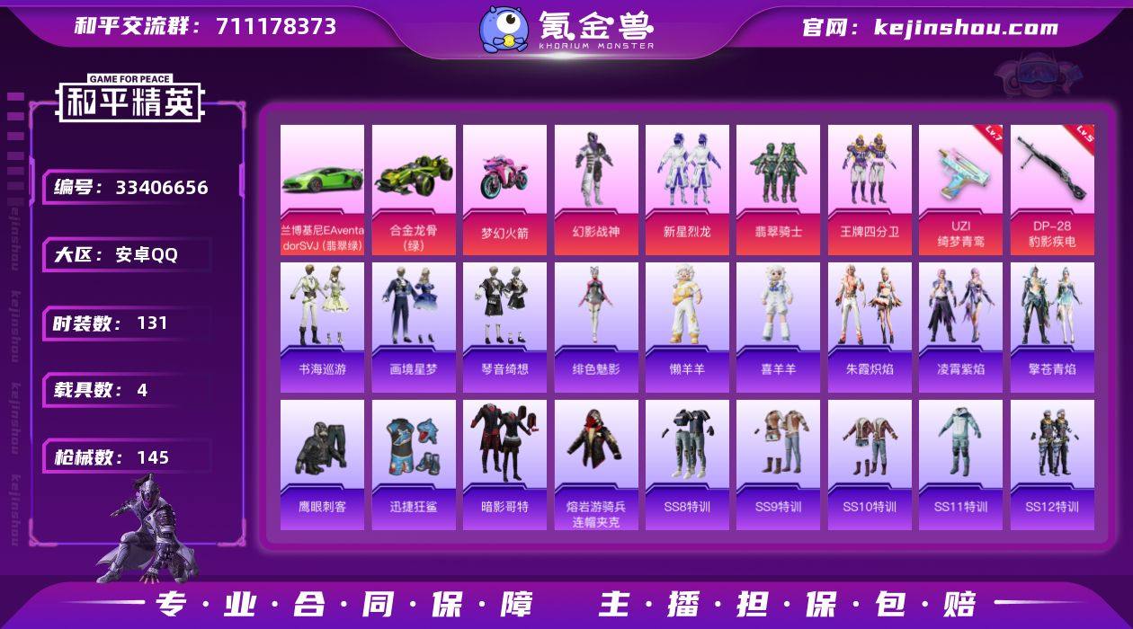 【kyhp1752】安卓 手Q-无敌战神框-4粉装-7特效枪-4载具-5粉色飞行器-52865热力值-8王牌印记-131套装-145枪皮 【热门品类】:套装-SS1特训,套装-暗影哥特,熔岩游骑兵连帽夹克 【粉色套装】:粉装-幻影战神,粉装-新星烈龙,粉装-翡翠骑士,粉装-王牌四分卫 【粉色枪皮等级】:ACE32-萌骑漫游(五级),UZI-绮梦青鸾(七级),AKS-74U-森灵之息(五级),Mk14-福马献瑞(三级),DP-28-豹影疾电(五级) 【粉色载具】:法拉利Roma(赛车红),兰博基尼Aventador SVJ(翡翠绿),合金龙骨(绿),双人摩托-梦幻火箭 【粉色枪皮】:ACE32-萌骑漫游,ACE32-百变纱华,UZI-绮梦青鸾,AKS-74U-森灵之息,Mk14-福马献瑞,DP-28-豹影疾电,破片手榴弹-贪吃小熊 【粉色飞行器】:炫彩糖果飞行器,梦幻火箭飞行器,心之恋语飞行翼,绮梦青鸾飞行器,纱华羽翼飞行器 【粉色降落伞】:梦幻火箭降落伞,伏魔团降落伞,四圣焕新降落伞,香水柠檬降落伞,环太平洋降落伞,喜羊羊与灰太狼降落伞,魔童闹海 哪吒降落伞,炫彩糖果降落伞,辉云木星降落伞,虹云熊熊降落伞 【稀有套装】:套装-雪国风尚,套装-炫彩糖果,套装-马上有钱,套装-迅捷龙虾,套装-朱霞炽焰,套装-凌霄紫焰,套装-擎苍青焰,玩偶...