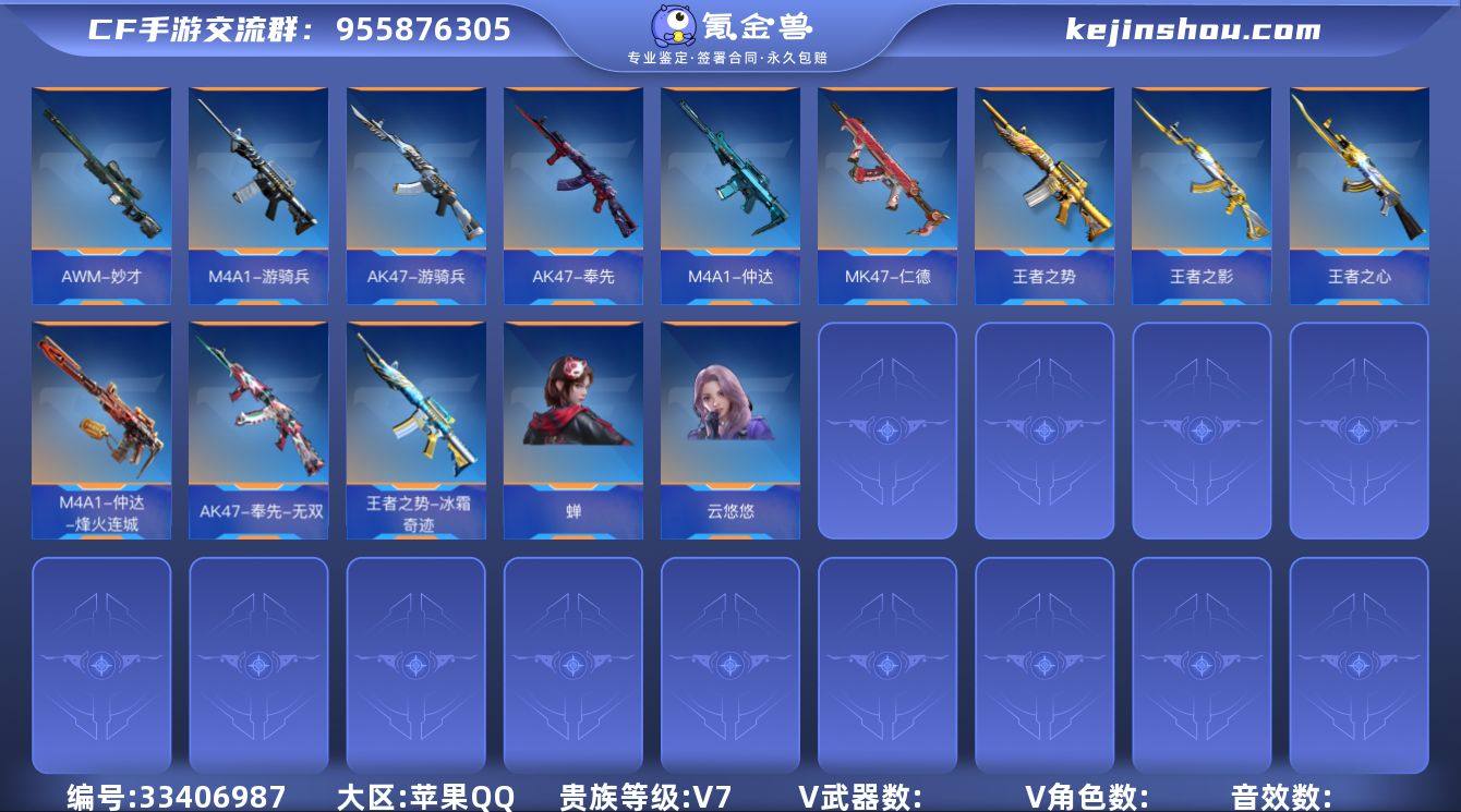 苹果Q\贵族7\蝉\炽天使-X\王者之势-冰霜奇迹\AK47-奉先-无双\M4A1-仲达-烽火连城\MK47-仁德\AK47-游骑兵-紫魇\M4A1-游骑兵-寒霜\王者之心\王者之影\王者之尊\AN94-盖\M200-竞技荣光\王者之神\AWM-妙才\M12S-雷霆王者-冰霜奇迹\详情见图