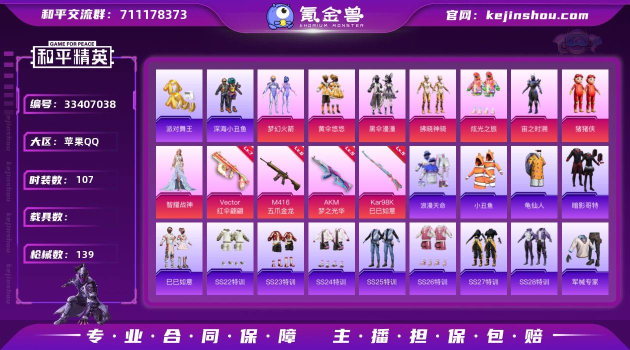苹果 手Q-8粉装-6特效枪-0载具-1粉色飞行器-44090热力值-6王牌印记-107套装-139枪皮 【热门品类】:粉装-梦幻火箭,套装-浪漫天命,套装-派对舞王,套装-深海小丑鱼,套装-小丑鱼,套装-龟仙人,套装-暗影哥特 【粉色套装】:粉装-梦幻火箭,粉装-黄伞悠悠,粉装-黑伞漫漫,粉装-拂晓神骑,粉装-炫光之旅,角色-宙之时溯,玩偶服-猪猪侠,角色-智耀战神 【粉色枪皮等级】:AKM-梦之光华(五级),M416-五爪金龙(六级),ACE32-萌骑漫游(五级),Vector-红伞翩翩(七级),Kar98K-巳巳如意(五级),Mk14-福马献瑞(五级) 【粉色枪皮】:AKM-梦之光华,M416-五爪金龙,ACE32-萌骑漫游,Vector-红伞翩翩,Kar98K-巳巳如意,Mk14-福马献瑞 【粉色飞行器】:拂晓神骑飞行器 【粉色降落伞】:极限特训降落伞,梦幻火箭降落伞,星之彼岸降落伞,怪笑疯兔降落伞,红伞翩翩降落伞,恐龙拽拽降落伞,天星战神降落伞,拂晓神骑降落伞,炫光之旅降落伞,猪猪侠降落伞 【稀有套装】:套装-龟仙人,套装-巳巳如意,套装-马上有钱,套装-迅捷龙虾,套装-雨过天青,套装-红釉青花 【稀有枪皮】:AKM-影袭,AKM-星之彼岸,AKM-破晓战魂,AKM-霓虹街区,AKM-龙的传人,SCAR-L-幽秘魅影,SCAR-L-甜蜜旋律...