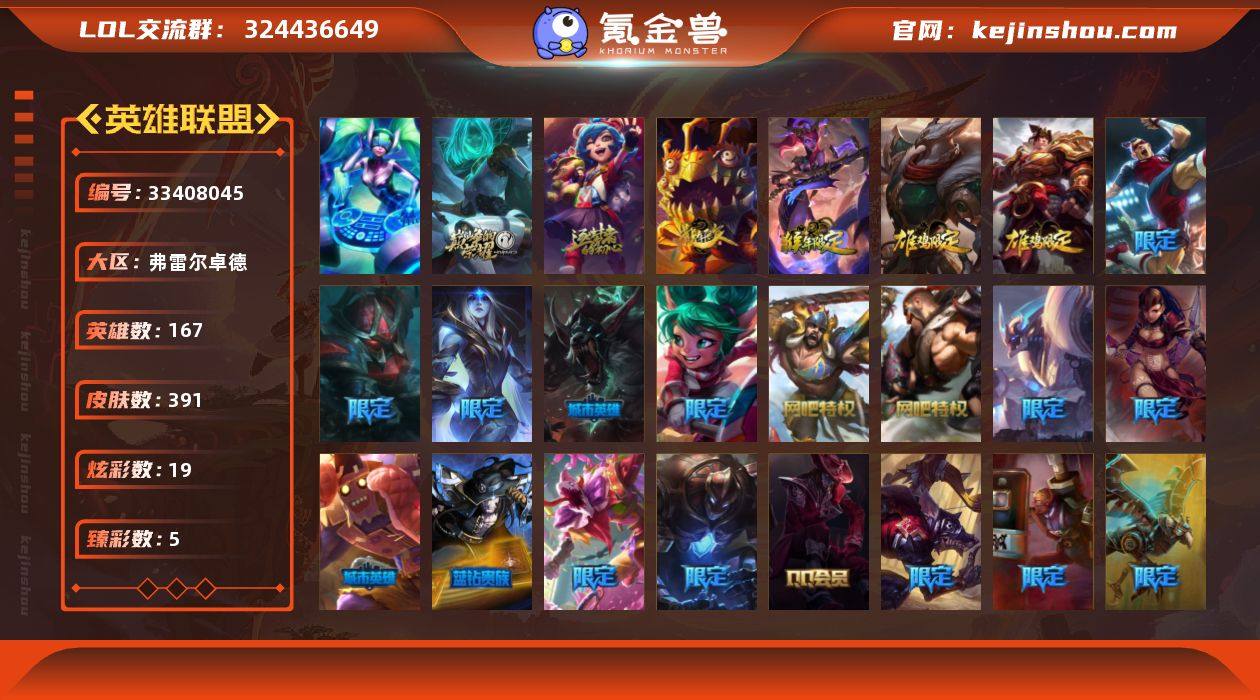 黄金段位-167英雄-391皮肤-19炫彩-1终极-4神话-64限定-39传说-91史诗 【神话皮肤】:十周年纪念安妮,源代码乐芙兰 【至臻皮肤】:至臻蒙面女郎莫甘娜,至臻永恒星灵佐伊 【臻彩皮肤】:天龙之子卡莎飞龙乘云,冠军之刃锐雯2016凯旋圣装,冠军之隐劫凯旋圣装,魔女阿卡丽虚荣,净雪之月莫甘娜冬虹 【年限皮肤】:醒狮克格莫,玉净夜叉凯特琳,张辽文远,司马懿仲达 【冰雪限定】:幸福女神乐芙兰,圣诞开心鬼提莫,圣诞精灵崔丝塔娜,圣诞狂欢努努和威朗普,圣诞糖果棒厄运小姐,阿木木“主人不要我了”,胡桃夹子萨科,平安夜女神娑娜,英勇玩具兵普朗克,冬季仙境卡尔玛,喜庆之树茂凯,雪默丁格,圣诞玩偶波比,冰雪驯鹿波比,圣诞老人古拉加斯,圣诞驯鹿克格莫,魄罗骑士瑟庄妮,圣诞老人布隆,冰雪节辛吉德 【终极皮肤】:DJ娑娜 【限定皮肤】:卧虎藏龙贾克斯,冠军之刃锐雯,冠军之矛卡莉丝塔,冠军之隐劫,Fnatic古拉加斯,暗杀星蒙多,暗杀星慎,SKTT1李青,SSW辛吉德,SSW图奇,SKTT1阿兹尔,EDG悠米,星之守护者伊泽瑞尔,胜利枪神格雷福斯,胜利女神奥莉安娜,胜利之剑亚托克斯,海贼瑞兹,南瓜头费德提克,鬼影重重魔腾,鬼影森森茂凯,无头骑士赫卡里姆,死亡誓约...