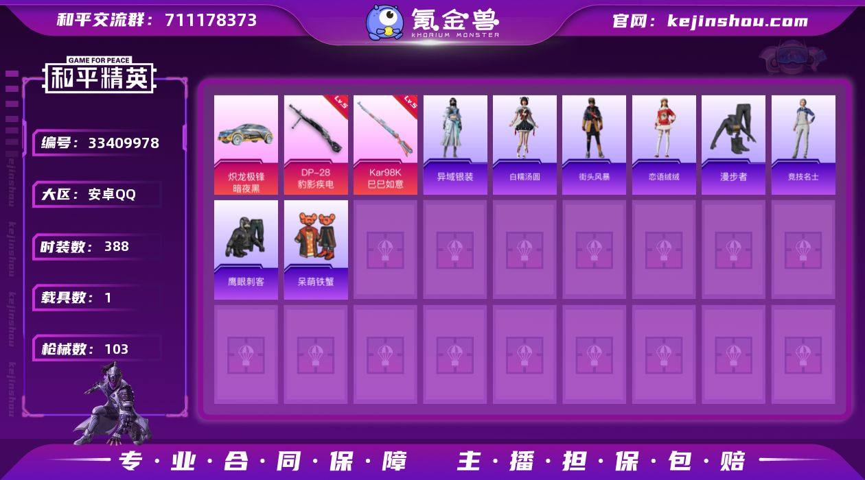 【特价出售】钱包不能注销安卓Q-1载具4特效枪5热门91套装103枪皮 26692热力值 3印记 历史超级王牌1星 【1载具】 炽龙极锋(暗夜黑) 【4特效枪】 Kar98K-巳巳如意 (5级) DP-28-豹影疾电 (5级) Mk14-福马献瑞 (5级) UMP45-萌骑冒险 (3级) 【5热门】 呆萌铁蟹 鹰眼刺客 漫步者 破蛋小黄鸡 极速红龙 【1背包】 幻影战神背包