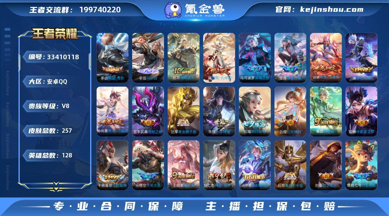 安卓Q-V8-最强王者段位-128英雄-257皮肤-1典藏皮肤-1无双-28传说-72史诗 【英雄全皮】:孙权全皮,敖隐全皮,空空儿全皮,影全皮 【荣耀典藏】:李白鸣剑曳影 【无双皮肤】:李信问心剑 【传说皮肤】:后羿神树通天,澜愿照九州拓,云缨幻光神枪,王昭君映山客,桑启鸣野蒿,云中君群星魔术团,亚连落雪白狼,孙尚香乘龙问璇玑,孙策乘龙淬吴钩,澜逐花归海,鲁班七号时之奇旅,云缨鹤归松栖,马可波罗妄想实况,东皇太一灼幽烈阳,伽罗炽翼辉光,孙悟空齐天大圣,狄仁杰神器狴犴令,马可波罗深海之息,孙策挚爱之约,虞姬启明星使,李信一念神魔,刘备时之恋人,干将莫邪久胜战神,达摩黄金狮子座,后羿黄金射手座,貂蝉仲夏夜之梦,宫本武藏地狱之眼,狄仁杰超时空战士 【限定皮肤】:蔡文姬夏日便利店,大乔绒语心约,虞姬夏日便利店,姜子牙天穹之誓,杨戬破阵退雄兵,狄仁杰阴阳师,赵云皇家上将,鲁班七号乒乒小将,鲁班七号时之奇旅,孙膑寅虎展翼,扁鹊奇幻香踪,元歌无心,甄姬落雪兰心,马可波罗深海之息,马可波罗妄想实况,狄仁杰魔术师,狄仁杰神器狴犴令,项羽海滩派对,老夫子航海奇遇记,孙悟空齐天大圣,李元芳匿光侦查者,李元芳云中旅人,虞姬启明星使,杨...