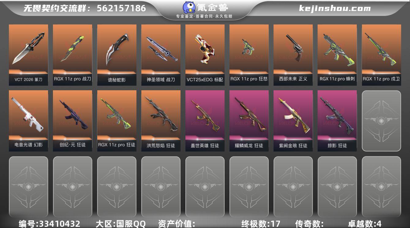【957193】【套装】:VCT 2026 赛季套装,RGX 11z Pro套装,魄月玄兔套装 【英雄】:幻棱,炼狱,维斯,暮蝶,钛狐,壹决,铁臂,捷风,雷兹,幽影,不死鸟,贤者,猎枭,蝰蛇,零,芮娜,尚勃勒,霓虹,斯凯,夜露,星礈,K/O,海神,盖可,黑梦,钢锁 【近战武器】:近战武器-蒙太奇 战斧,近战武器-VCT 2026 篆刀,近战武器-RGX 11z Pro 战刀,近战武器-镭切,近战武器-魄月玄刃,近战武器-天玄刀,近战武器-诡秘蛇影 军刀,近战武器-神圣领域 战刀 【狂徒】:狂徒-洪荒怒焰,狂徒-创·纪元,狂徒-RGX 11z Pro,狂徒-掠影,狂徒-盖世英雄,狂徒-耀鳞威龙,狂徒-紫阙金琅,狂徒-魄月玄兔,狂徒-诡秘蛇影 【幻影】:幻影-电音光谱,幻影-神圣领域,幻影-蒙太奇,幻影-末日之翼,幻影-电音光谱 【戍卫】:戍卫-RGX 11z Pro,戍卫-月球哨兵,戍卫-折光棱晶 【獠犬】:獠犬-神圣领域 【冥驹】:冥驹-合金突袭,冥驹-星云暗涌 【飞将】:飞将-魄月玄兔,飞将-末日之翼 【莽侠】:莽侠-诡秘蛇影,莽侠-月球哨兵 【战神】:战神-神圣领域,战神-蒙太奇 【奥丁】:奥丁-末日之翼 【判官】:判官-诡秘蛇影 【雄鹿】:雄鹿-月球哨兵 【骇灵】:骇灵-魄月玄兔,骇灵-蒙太奇,骇灵-星云暗...