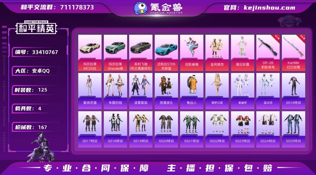 【AYH853】粉装3/粉枪2/载具4/珍稀飞行器72275,72316/套装125/枪皮167/热力值54014/历史最高段位:王牌印记3次/Lv:61/五级Kar98K-巳巳如意/五级DP-28-豹影疾电/龟仙人/浪漫波比/花影阑珊/金风银杏/烟云彩露/玛莎拉蒂MC20(星石白)/玛莎拉蒂Grecale(薄荷绿)/宾利飞驰(布罗德盖棕双色)/迈凯伦570S(天际蓝)/Kar98K-巳巳如意/DP-28-豹影疾电/飞行器-庄周梦蝶/繁龙极客飞行器/机甲封神降落伞/暗夜玫瑰降落伞/蓝莓炮弹降落伞/绿意幻情降落伞/绚金瑰梦降落伞/暗夜鎏金降落伞/天星战神降落伞/绯穹魔姬降落伞/樱梦幻音/紫幽梦/蓝冰羽/朱霞炽焰/凌霄紫焰/紫俏灵猫/AKM-彩虹符号/AKM-春暖花开/AKM-破晓战魂/AKM-虎虎生威/AKM-龙的传人/M16A4-幻世战舞者/M16A4-甜心亚梦/M16A4-蓝色火焰/SCAR-L-炫彩节奏/SCAR-L-玉兔迎春/SCAR-L-红色方程式/M416-夜灯/M416-糯团青竹/M416-红色方程式/M416-蓝色火焰/GROZA-异彩先驱/GROZA-彩虹符号/GROZA-田园牧歌/GROZA-蓝莓炮弹/AUG-2P战斗服款/AUG-天降萌叽/AUG-耀粉歌者/QBZ-彩虹符号/QBZ-绚金瑰梦/QBZ-飞驰魅影/QBZ-绒兔团圆/M762-橘柚倾心/M762-瑞龙福将/M762-第五大道/MK47-妙红点点/Mk47-洛神天依/G36C-青丘仙客/G36C-星穹咏叹调/AC-VAL-甜心亚梦/AC-...