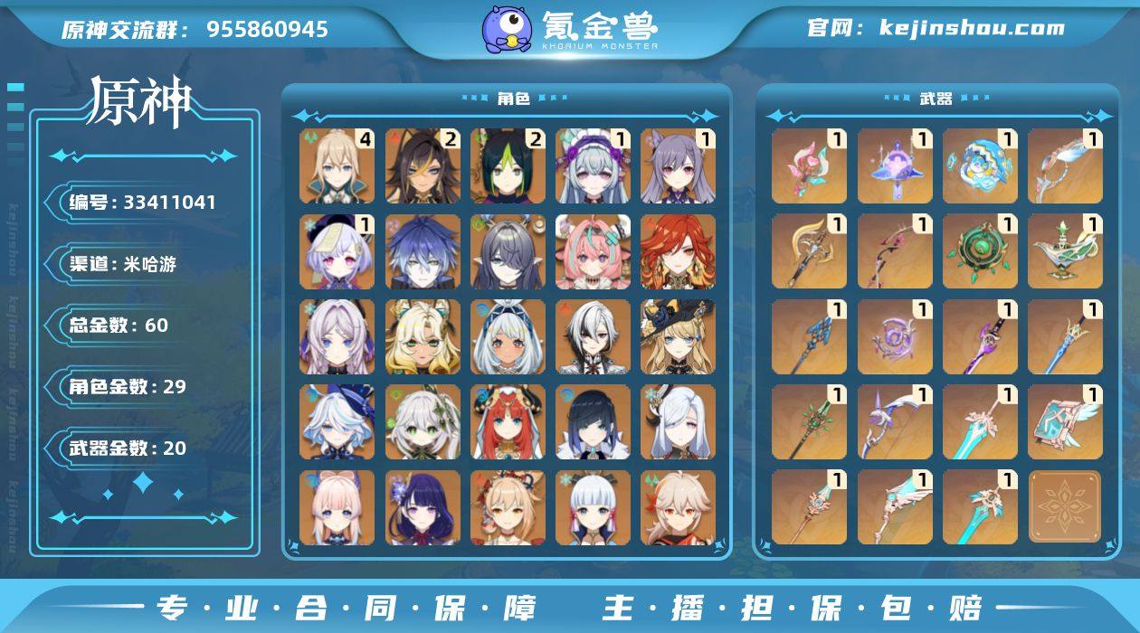 60级/60黄/女主/29个五星角色/20个五星武器 0命阿蕾奇诺,0命娜维娅,0命芙宁娜,2命迪希雅,0命纳西妲,0命妮露,2命提纳里,0命夜兰,0命申鹤,0命雷电将军,0命枫原万叶,0命神里绫华,0命钟离,0命宵宫,0命可莉,0命珊瑚宫心海,1命刻晴,1命七七,4命琴,0命莫娜,0命迪卢克,0命希诺宁,0命玛拉妮,0命玛薇卡,0命茜特菈莉,1命梦见月瑞希,0命瓦雷莎,0命菈乌玛,0命菲林斯,精1白雨心弦,精1裁断,精1最初的大魔术,精1碧落之珑,精1千夜浮梦,精1息灾,精1不灭月华,精1雾切之回光,精1苍古自由之誓,精1和璞鸢,精1天空之脊,精1天空之翼,精1阿莫斯之弓,精1天空之刃,精1天空之卷,精1天空之傲,精1冲浪时光,精1寝正月初晴,精1溢彩心念
