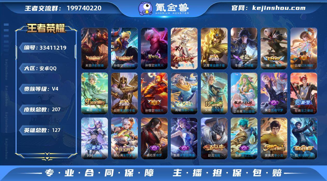 安卓Q-V4-永恒钻石V段位-127英雄-207皮肤-2典藏皮肤-8传说-48史诗【英雄全皮】:孙权全皮,敖隐全皮【荣耀典藏】:孙悟空全息碎影,关羽赤影疾锋【传说皮肤】:澜愿照九州拓,云缨幻光神枪,桑启鸣野蒿,曜云鹰飞将,李信一念神魔,达摩黄金狮子座,后羿黄金射手座,孙悟空地狱火【限定皮肤】:姜子牙天穹之誓,杨戬破阵退雄兵,狄仁杰阴阳师,赵云皇家上将,赵云龙胆,高渐离死亡摇滚,甄姬游园惊梦,狄仁杰万华元夜,达摩沙漠行僧,项羽海滩派对,程咬金演武夺筹,兰陵王金庭之子,李元芳云中旅人,钟馗驱傩正仪,干将莫邪胡桃夹子,鬼谷子原初探秘者,鬼谷子五谷丰年,苏烈千军破阵,弈星混沌棋,沈梦溪大漠名商,裴擒虎李小龙,裴擒虎擒涛扼浪,上官婉儿梁祝,桑启海盐诗旅,阿古朵江河有灵,张良古海寻踪,鬼谷子天穹祈灯,姬小满妄想食味,沈梦溪龙舞盛年,刘邦剑破天穹,程咬金群星魔术团,镜青焰无极,项羽苍威无极,芈月浮光幕影,周瑜熔金海岸【年限皮肤】:澜愿照九州拓【赛季限定】:弈星混沌棋,鬼谷子原初探秘者,狄仁杰万华元夜,程咬金演武夺筹,钟馗驱傩正仪,苏烈千军破阵,达摩沙漠行僧,兰陵王金庭之子,沈梦溪大漠名商,李元芳云中旅人,桑启海盐诗旅,...