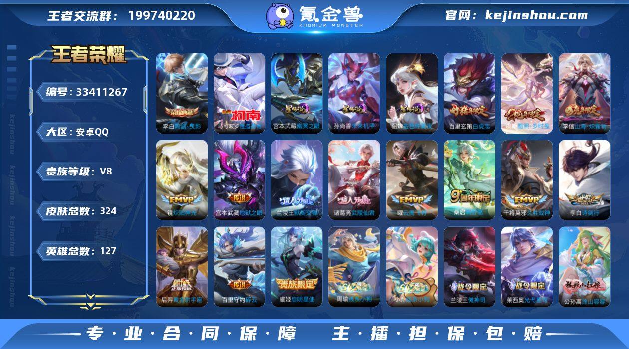 安卓Q-V7-永恒钻石III段位-127英雄-324皮肤-1典藏皮肤-1珍品传说-14传说-108史诗【英雄全皮】:孙权全皮,敖隐全皮,空空儿全皮,影全皮【荣耀典藏】:李白鸣剑曳影【珍品传说】:马可波罗怪盗基德【传说皮肤】:虞姬愿照岁时盈,桑启鸣野蒿,李信山海炽霜斩,李白诗剑行,百里守约碎云,兰陵王默契交锋,镜炽阳神光,虞姬启明星使,曜云鹰飞将,干将莫邪久胜战神,百里玄策白虎志,后羿黄金射手座,诸葛亮武陵仙君,宫本武藏地狱之眼【限定皮肤】:姜子牙天穹之誓,狄仁杰阴阳师,赵云皇家上将,赵云引擎之心,墨子神迹守卫,孙尚香蔷薇恋人,庄周高山流水,钟无艳超时空战士,扁鹊奇幻香踪,白起夜都怪侠,芈月白晶晶,芈月幻夜卜梦,吕布御风骁将,元歌云间偶戏,元歌无心,甄姬落雪兰心,典韦岱宗,马可波罗暗影游猎,马可波罗山海玄木吟,狄仁杰魔术师,狄仁杰万华元夜,达摩沙漠行僧,项羽海滩派对,老夫子醍醐杖,老夫子航海奇遇记,关羽冰锋战神,程咬金演武夺筹,韩信逐梦之影,韩信飞衡,韩信傲雪梅枪,兰陵王默契交锋,兰陵王金庭之子,花木兰青春决赛季,亚瑟潮玩骑士王,孙悟空至尊宝,孙悟空孙行者,后羿如梦令,后羿圣弓游侠,李元芳银河之约,李元芳云中旅人...
