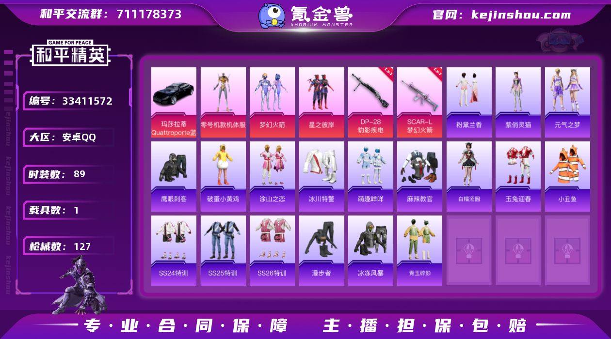 M1047676【身法号1载具-3粉装-2特效枪 梦幻火箭 黄螳螂 小丑鱼 SCAR-L-梦幻火箭[7级]】安卓手Q-1载具-3粉装-2特效枪-89套装-127枪皮-5王牌印记-坚韧铂金Ⅳ-35483热力值【1载具】玛莎拉蒂Quattroporte(夜幕蓝)【3粉装】星之彼岸,角色-零号机款机体服,梦幻火箭【2特效枪】SCAR-L-梦幻火箭[7级],DP-28-豹影疾电[5级]【1稀有】小丑鱼【6飞行器】马上有福飞行器,鸡智如我飞行器,空岛之星尾迹,炫彩糖果飞行器,光之冒险尾迹,登顶巅峰飞行器【1头盔】梦幻火箭头盔【1背包】梦幻火箭背包【210其它衣服和枪皮】照水倚天,SS23特训,SS22特训,SS24特训,SS35特训,SS34特训,元气之梦,王牌教练,SS25特训,炫彩糖果,魅力单车,朱霞炽焰,薄荷星砂,黄色名流,角色-零款战斗服,轻风白浪,血色贵族,SS37特训,光之冒险,酷萌兔限定,午间小调,蓝色运动,深蓝色名流,SS26特训,竞技名士,热血骑手,云魄琉璃,和煦暖阳,冷焰舞者,荣耀,完美偶像,阳光火鸡,破晓战魂,怒火燎原,鹰眼刺客,黄色伏地魔,街头风暴,风暴特警,白糯汤圆,麻辣教官,冰川特警,蓝色守护者,绮丽涂鸦,缤纷果语,角色-紫俏灵猫,娇憨猪猪,萌鸡速递,风迹短诗,角色-明日香款战斗服,白色伏地魔,幻世战舞者,柠萌假日,涂山之恋,海岛探路者,漫步者,冰冻风暴,破...