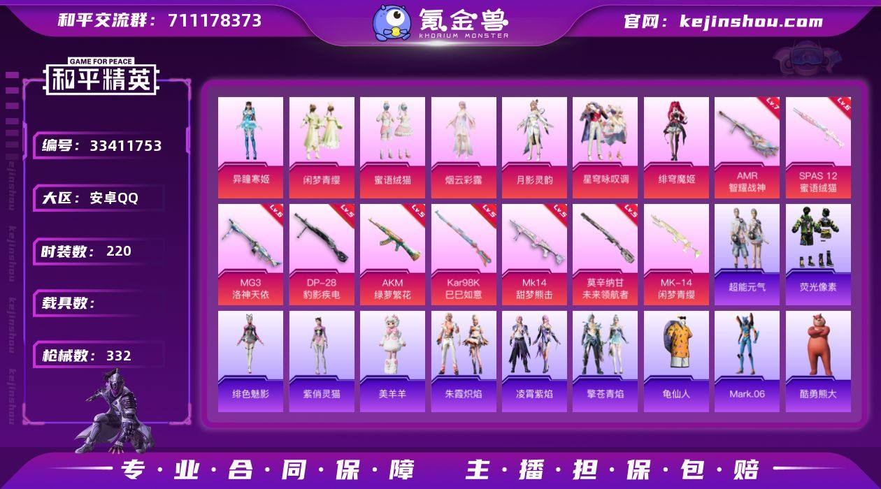 【kyhp1838】安卓 手Q-8粉装-12特效枪-0载具-3粉色飞行器-99972热力值-15王牌印记-220套装-332枪皮 【热门品类】:套装-龟仙人,角色-Mark.06 【粉色套装】:粉装-闲梦青缨,粉装-蜜语绒猫,角色-烟云彩露,角色-月影灵韵,粉装-星穹咏叹调,角色-绯穹魔姬,角色-异瞳寒姬,角色-鸢尾珑雾 【粉色枪皮等级】:AKM-绿萝繁花(五级),ACE32-萌骑漫游(五级),AKS-74U-森灵之息(五级),Kar98K-巳巳如意(五级),Mk14-甜梦熊击(五级),Mk14-福马献瑞(五级),莫辛纳甘-未来领航者(五级),AMR-智耀战神(七级),SPAS-12-蜜语绒猫(六级),DP-28-豹影疾电(五级),MG3-洛神天依(六级) 【粉色枪皮】:AKM-绿萝繁花,ACE32-萌骑漫游,AKS-74U-森灵之息,Kar98K-巳巳如意,Mk14-闲梦青缨,Mk14-甜梦熊击,Mk14-福马献瑞,莫辛纳甘-未来领航者,AMR-智耀战神,SPAS-12-蜜语绒猫,DP-28-豹影疾电,MG3-洛神天依 【粉色飞行器】:炫彩糖果飞行器,灵猫魔法师飞行器,云梦轻舟飞行器 【粉色降落伞】:绝对恒星降落伞,洛神天依降落伞,橘柚倾心降落伞,歌者泠鸢降落伞,音爆索尼克降落伞,纯梦嫁纱降落伞,白勺歌姬降落伞,闲梦青缨降落伞,蜜语绒猫降落伞,精灵梦叶罗丽降落伞,守护天翼降落伞,初...