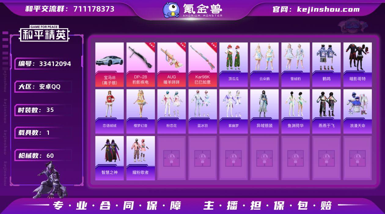 M1047675【1载具-3特效枪 AUG-暖羊咩咩[5级暗影哥特,NV战队服,浪漫天命】安卓手Q-1载具-3特效枪-35套装-60枪皮-3王牌印记-热血青铜Ⅴ-15385热力值【1载具】宝马i8(离子银)【3特效枪】DP-28-豹影疾电[5级],Kar98K-巳巳如意[5级],AUG-暖羊咩咩[5级]【3稀有】暗影哥特,NV战队服,浪漫天命【3飞行器】异域银装飞行器,彩虹独角兽飞行器,绯果甜心飞行器【89其它衣服和枪皮】滨海厨神,智慧之神,魅力单车,萌鸡速递,幻世保卫者,云朵鹅,蓝海鲸歌,夏日倾情,恋语绒绒,鹤鸣,光之冒险,SS32特训,异域银装,紫幽梦,SS31特训,黄色运动,猎鹰,长空猛禽,疯狂小兔子,SS33特训,粉恋花,耀粉歌者,燕燕于飞,白色伏地魔,竞技名士,鱼渊荷华,战术大师,雪绒豹,樱梦幻音,顶瓜瓜,蓝冰羽,黑色伏地魔,QBZ-绒兔团圆,UZI-天降萌叽,大砍刀-云朵鹅,S686-雪月幻音,SCAR-L-玉兔迎春,AUG-异域银装,S1897-糯团青竹,DBS-彩虹符号,DBS-幻彩电音,SCAR-L-红色方程式,S1897-紫幽梦,S1897-荧海星豚,十字弩-异域银装,SLR-霓彩脉冲,十字弩-燕燕于飞,M417-玩趣呆呆,破片手榴弹-拽到爆炸,汤姆逊-天降萌叽,SPAS-12-云朵鹅,S12K-霓彩脉冲,DP-28-彩虹符号,M762-云朵鹅,蜜獾-鸡智如我,Famas-霓彩脉冲,野牛-燕燕于飞,沙漠之鹰-云朵鹅,平底...
