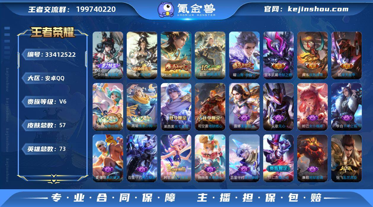 安卓Q-V6-最强王者段位-73英雄-57皮肤-1无双-1珍品传说-6传说-19史诗 【英雄全皮】:孙权全皮,敖隐全皮 【无双皮肤】:公孙离离恨烟 【珍品传说】:伽罗沧流箭 【传说皮肤】:狄仁杰神骥赴朔漠,后羿神树通天,典韦战鼓燎原,曜山海苍雷引,铠绛天战甲,宫本武藏地狱之眼 【限定皮肤】:公孙离离恨烟,狄仁杰阴阳师,赵云皇家上将,元歌无心,狄仁杰魔术师,项羽海滩派对,曜山海苍雷引,司空震地狱燃心,阿古朵江河有灵 【年限皮肤】:曜山海苍雷引 【赛季限定】:甄姬逆浪荇歌,亚瑟荣光之誓 【战令限定】:司空震地狱燃心,莱西奥光弋星穹,明世隐往忆晖光,周瑜线条小狗,小乔线条小狗 【史诗皮肤】:周瑜线条小狗,小乔线条小狗,莱西奥光弋星穹,阿古朵江河有灵,司空震地狱燃心,百里守约真我赫兹,元歌无心,李元芳逐浪之夏,百里守约特工魅影,雅典娜冰冠公主,夏侯惇乘风破浪,张飞乱世虎臣,李白千年之狐,妲己女仆咖啡,嬴政摇滚巨星,孙尚香水果甜心,廉颇地狱岩魂,狄仁杰魔术师,赵云皇家上将,露娜紫霞仙子 【其他皮肤】:影百相守梦,鲁班七号班班快跑,虞姬溯影追猎,蚩奼极光幻客,艾琳鹤鸣心笺,孙权径山谋武,明世隐往忆晖光,亚瑟荣光之誓,云中君云械...
