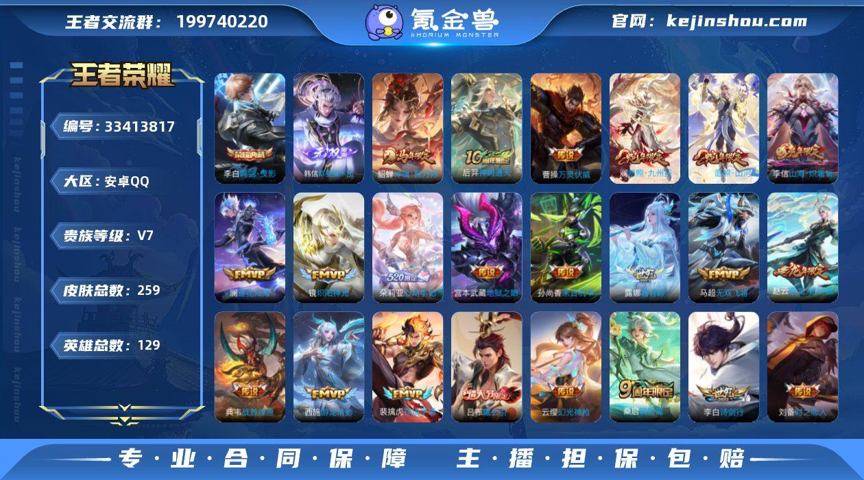 安卓Q-V7-永恒钻石III段位-129英雄-259皮肤-1典藏皮肤-1无双-27传说-77史诗 【英雄全皮】:孙权全皮,司空震全皮,戈娅全皮,空空儿全皮,海诺全皮 【荣耀典藏】:李白鸣剑曳影 【无双皮肤】:韩信群星魔术团 【传说皮肤】:貂蝉神骥聚万邦,后羿神树通天,曹操万灵伏威,司空震愿照山河定,澜愿照九州拓,云缨幻光神枪,裴擒虎祥瑞亨通,桑启鸣野蒿,朵莉亚心动手记,吕布曦玄引,典韦战鼓燎原,赵云乘龙铭钟鼎,澜逐花归海,露娜霜月吟,干将莫邪画中仙,花木兰燃星之曲,伽罗炽翼辉光,李信山海炽霜斩,李白诗剑行,马超无双飞将,孙策挚爱之约,西施游龙清影,镜炽阳神光,虞姬启明星使,刘备时之恋人,孙尚香末日机甲,宫本武藏地狱之眼 【限定皮肤】:暃埋骨钱,蒙犽顽岩魄,虞姬夏日便利店,姜子牙天穹之誓,狄仁杰阴阳师,赵云皇家上将,孙尚香蔷薇恋人,高渐离玩趣恶龙,阿轲迷踪丽影,元歌无心,马可波罗山海玄木吟,狄仁杰魔术师,狄仁杰万华元夜,项羽海滩派对,老夫子醍醐杖,露娜一生所爱,韩信飞衡,花木兰燃星之曲,李元芳云中旅人,虞姬启明星使,钟馗驱傩正仪,女娲朔望之晖,干将莫邪画中仙,鬼谷子原初探秘者,百里玄策原初追逐者,沈梦溪星空之诺,明世...