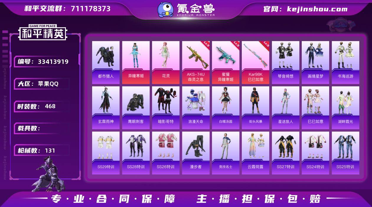 【特价出售】苹果Q-2稀有2粉装5特效枪7热门117套装131枪皮 34903热力值 2印记 历史传奇王牌13星 【2稀有】 都市猎人 浪漫天命 【2粉装】 花灵 异瞳寒姬 【5特效枪】 AKS-74U-森灵之息 (5级) Kar98K-巳巳如意 (5级) 蜜獾-异瞳寒姬 (5级) Mk14-福马献瑞 (3级) UMP45-萌骑冒险 (4级) 【7热门】 龟仙人 鹰眼刺客 AG战队服 暗影哥特 漫步者 破蛋小黄鸡 极速红龙 【1背包】 幻影战神背包