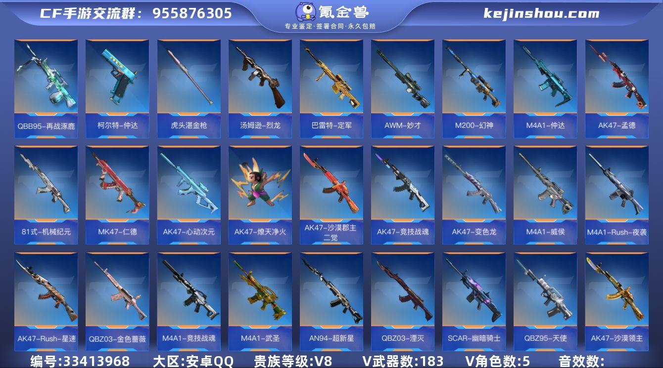 大师-5英雄角色数-178英雄武器数 【王者系列】:王者之灵,王者之影,王者之魄,王者之心,王者之锋,王者之狱,王者之魂,王者之啸,王者之烈 【热门武器】:MK47-仁德,81式-机械纪元,AK47-孟德,M4A1-仲达,M4A1-威侯,M4A1-武圣,M4A1-游骑兵,M200-幻神,AWM-妙才,巴雷特-定军,COP 357-赤龙*2 【角色】:零,樱,关小雨,云悠悠,雾萌萌 【英雄武器】:AK47-无影,AK47-火麒麟,AK47-黑武士觉醒,AK47-沙漠领主,AK47-Rush-星速,AK47-竞技战魂,AK47-变色龙,AK47-孟德,AK47-沙漠郡主-二觉,AK47-燎天净火,AK47-心动次元,AK47-木兰,M4A1-雷神,M4A1-黑骑士,M4A1-黑龙,M4A1-死神*2,M4A1-游骑兵,M4A1-武圣,M4A1-竞技战魂,M4A1-Rush-夜袭,M4A1-威侯,M4A1-仲达,QBZ95-天使,SCAR-幽暗骑士,SCAR-探星者,剑齿虎,AN94-超新星,9A91-天神,M14EBR-暗夜,QBZ03-湮灭,QBZ03-金色蔷薇,81式-机械纪元,MK47-仁德,AWM-天龙,AWM-妙才,AWM-裁决,AWM-天使,巴雷特-毁灭,巴雷特-极光*2,巴雷特-枪娘,巴雷特-定军,巴雷特-金色蔷薇,巴雷特-毁灭-审判者,巴雷特-变色龙,暗杀星,M200-幻神,98K-黑骑士,MG3-雏凤*5,加特林-堡垒,加特林-炼狱,MG36-黑骑士,Q...