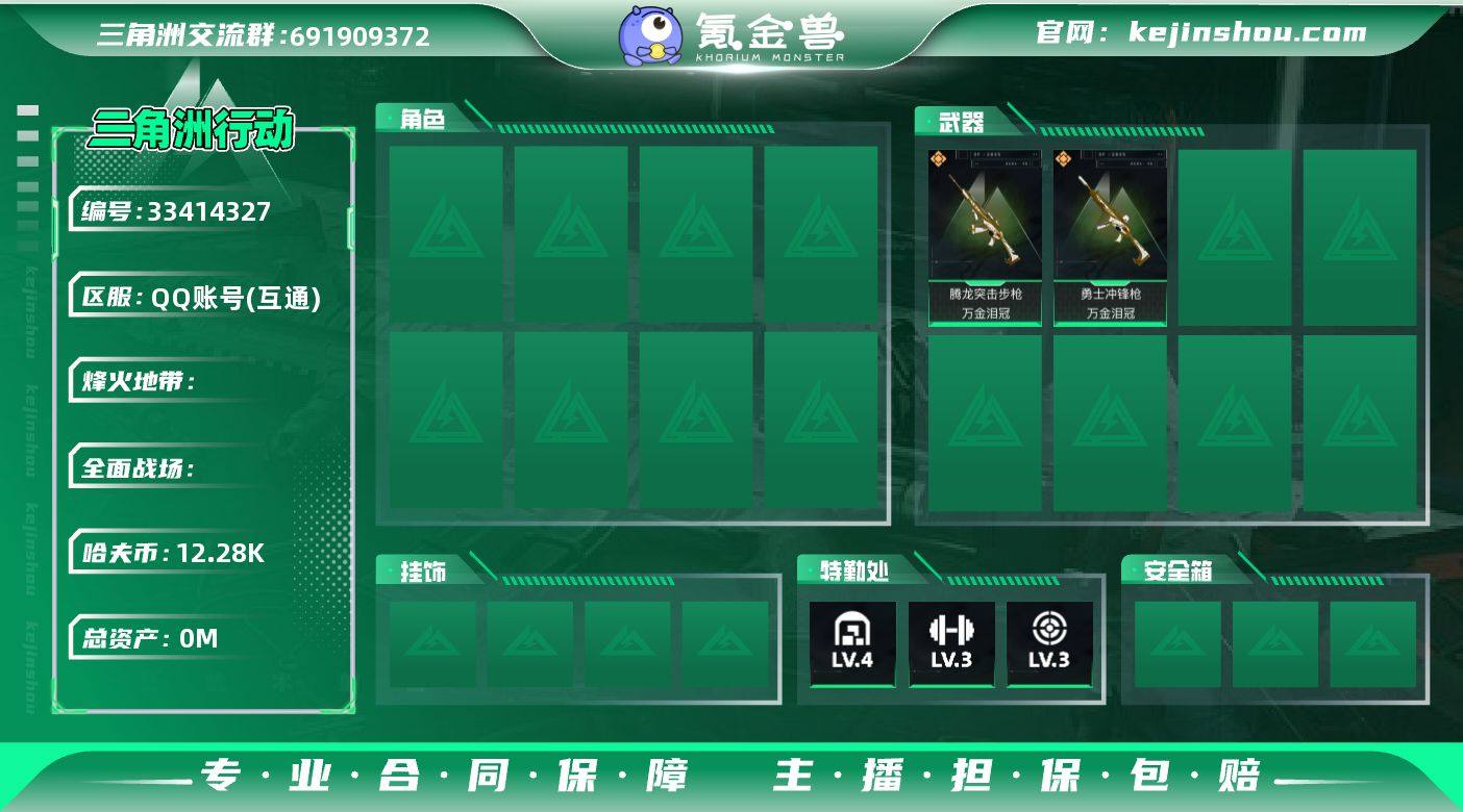 78m总资产-12285k哈夫币-35烽火等级-钻石-1战场等级-无军衔 【近战皮肤】:近战-黑鹰 【传说外观】:腾龙突击步枪-万金泪冠,勇士冲锋枪-万金泪冠,AWM狙击步枪-万金泪冠 【史诗外观】:MP7冲锋枪-六套之力,QJB201轻机枪-炽焰 【稀有外观】:SG552突击步枪-贴花艺术 【普通外观】:QJB201轻机枪-典雅 【挂饰】:挂饰-万金泪冠