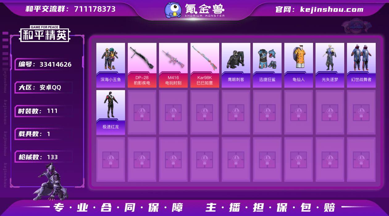 【957240】crhp51+【1车特4M416-电玩时刻满级 小丑鱼 无二不包 】 安卓手Q-1载具-4特效枪-111套装-133枪皮-9王牌印记-荣耀皇冠Ⅳ-39547热力值【1载具】仰望U7(阿盖尔紫)【4特效枪】DP-28-豹影疾电[5级],Kar98K-巳巳如意[5级],M416-电玩时刻[5级],Mk14-福马献瑞[4级]【1稀有】小丑鱼【3飞行器】顶峰精英尾迹,光之冒险尾迹,空岛之星尾迹【1背包】深海小丑鱼背包【239其它衣服和枪皮】冰川格斗者,王牌教练,龙腾端午,星途旅人,SS22特训,光之冒险,顶瓜瓜,绯格组合,遗迹猎人,SS35特训,纯真浪花,战术大师,异彩先驱,SS29特训,SS25特训,轻风白浪,特训学院,虎虎生威吉莉,SS18特训,格斗先锋,霓虹极客,黄色运动,沙漠兵团,SS37特训,冰河战士,骑行爱好者,竞技名士,牛气冲天,炫蓝之夏,蓝色运动,完美偶像,妙红点点,海岛探路者,SS33特训,福星高照,SS28特训,和煦暖阳,龙舌兰冰茶,马上来财,SS34特训,冰川特警,热情海星,燃烧卡路里,田园牧歌,蓝彩潮人,冷焰舞者,狙击之神,灼焰舞者,SS16特训,海盐绵绵冰,霓虹街区,SS21特训,巳巳如意,探宝勇士,柠萌假日,深蓝色名流,黑色伏地魔,旭日情侣,迅捷龙虾,玉兔迎春,角色-米开朗基罗,黎明保卫者,白色伏地魔,长空猛禽,龙魂突击队,福马献瑞,SS30特训,幻彩翩翩,龙的...