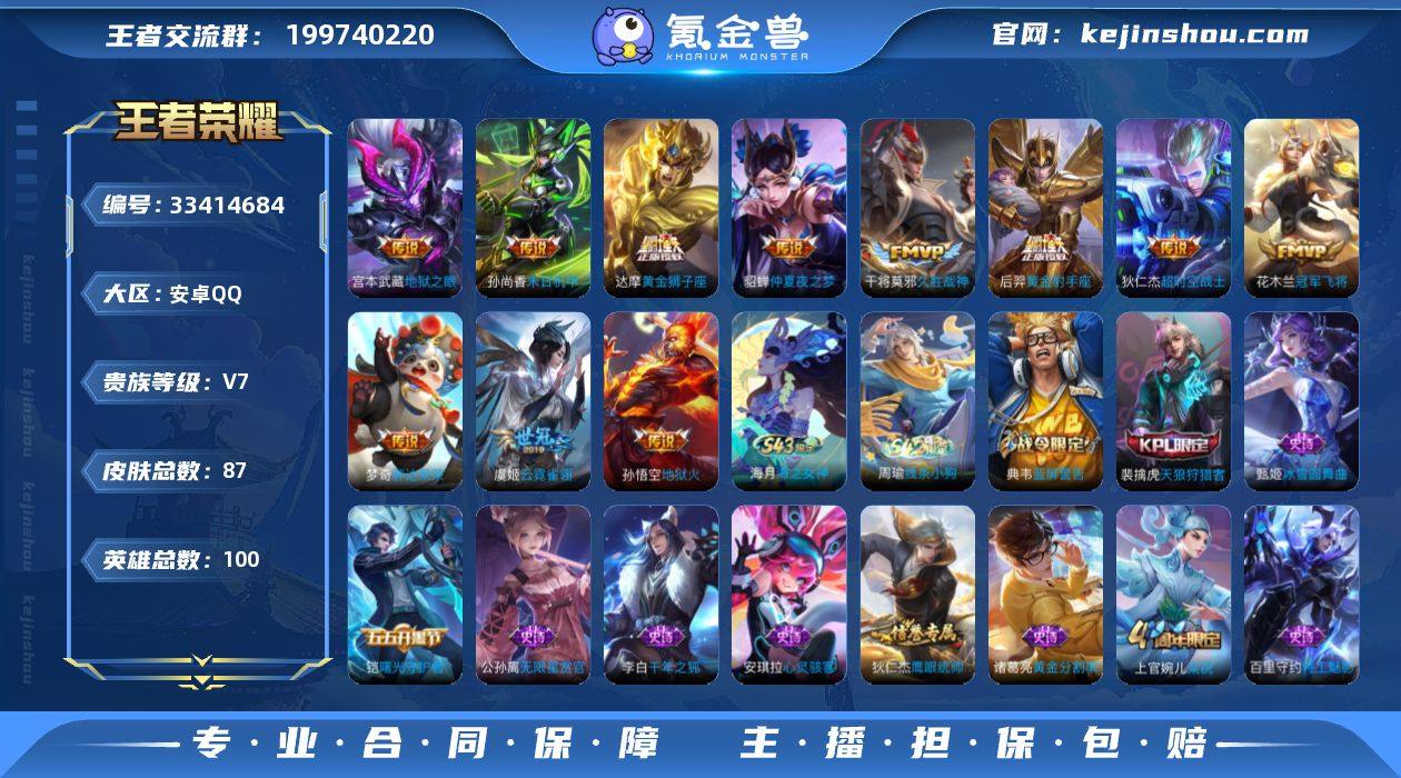 【店长主推精品号·久胜战神·云霓雀翎·黄金狮子座·冠军飞将·胖达荣荣·黄金射手座·仲夏夜之梦·末日机甲·地狱之眼·地狱火·超时空战士·天狼狩猎者·无二次包过】YXw24152-安卓Q-100英雄-87皮肤-0王者印记-70铭文-贵族积分4w【贵族7】【11传说】【因赛季更新游戏段付以上号为准!】 【传说皮肤】:干将莫邪久胜战神,虞姬云霓雀翎,达摩黄金狮子座,花木兰冠军飞将,梦奇胖达荣荣,后羿黄金射手座,貂蝉仲夏夜之梦,孙尚香末日机甲,宫本武藏地狱之眼,孙悟空地狱火,狄仁杰超时空战士 【限定皮肤】:大乔绒语心约,姜子牙天穹之誓,狄仁杰阴阳师,赵云皇家上将,吕布猎兽之王,夏侯惇朔风刀,典韦蓝屏警告,狄仁杰魔术师,项羽海滩派对,牛魔御旌,女娲朔望之晖,弈星混沌棋,裴擒虎天狼狩猎者,狂铁御狮,盾山御銮,上官婉儿梁祝,刘邦剑破天穹,刘备异域游侠,周瑜熔金海岸 【赛季限定】:狂铁御狮,牛魔御旌,盾山御銮,夏侯惇朔风刀,弈星混沌棋,刘邦剑破天穹,姜子牙天穹之誓 【战令限定】:吕布猎兽之王,典韦蓝屏警告,女娲朔望之晖,周瑜线条小狗 【史诗皮肤】:海月海之女神,周瑜线条小狗,上官婉儿梁祝,公孙离无限星赏官,狄仁杰鹰眼统帅,裴擒虎天狼狩猎者,典韦蓝屏...